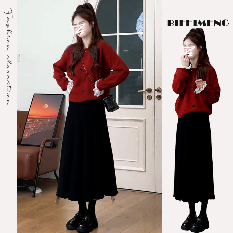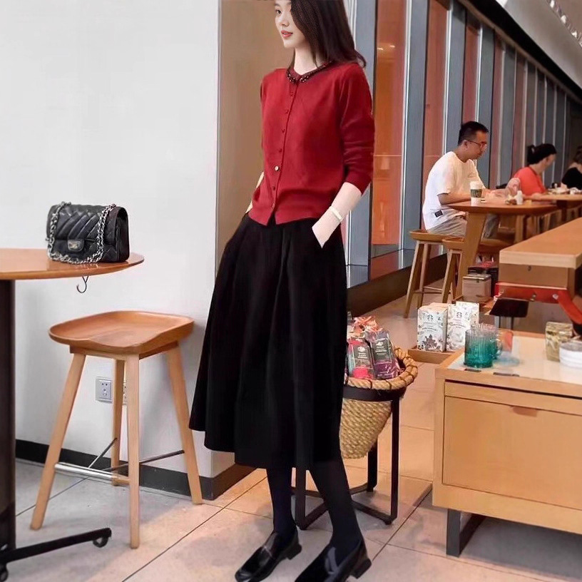 巨两件套的冬季半身裙套装一整套2025好看感松弛针织开衫红色穿搭