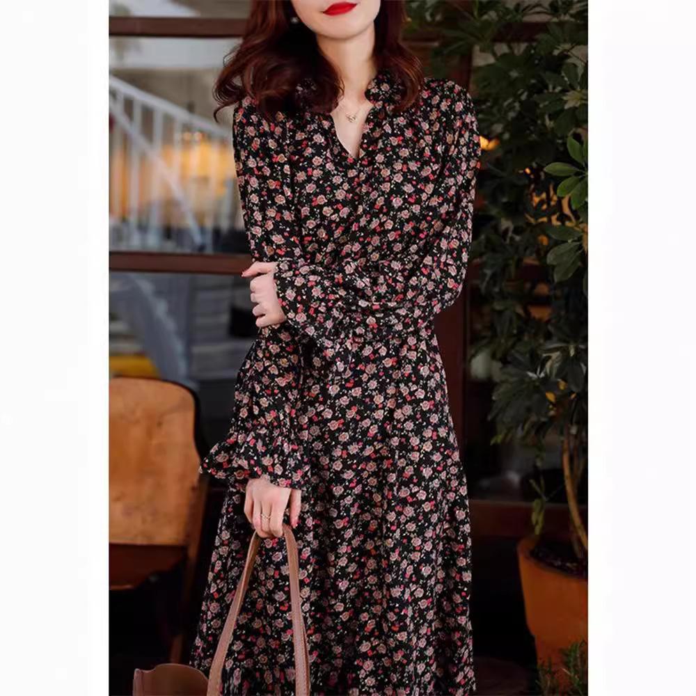 ティーブレイクフレンチレトロ気質Vネック花柄ドレス2025秋新作ウエスト痩身ボトムAラインロングスカート