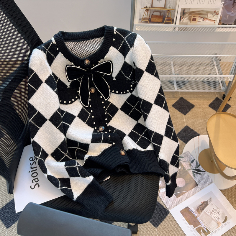 2023冬の新型気質名媛丸首菱格ニット小香風単列ボタン蝶ネクタイ減齢セーター
