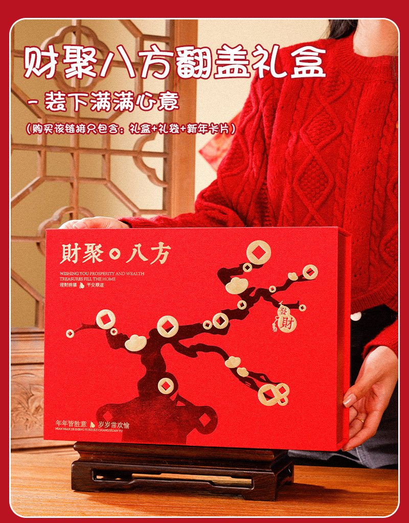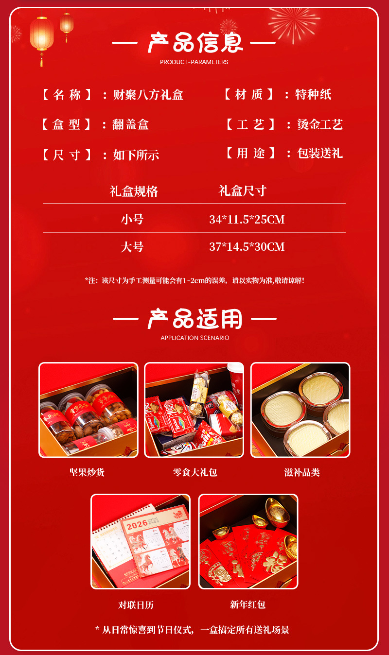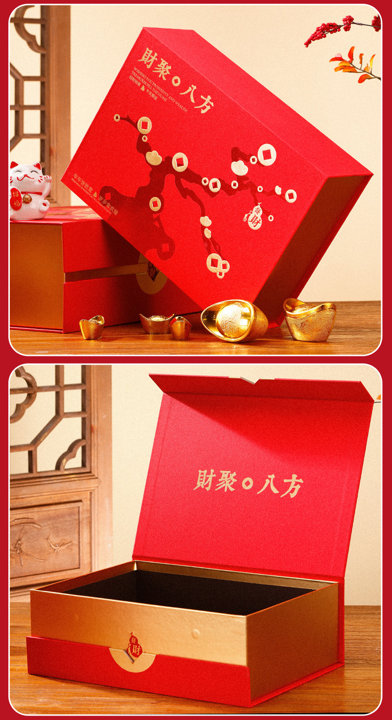规格型号 财聚八方翻盖盒(小号);小号34*25*11.5㎝(空盒+礼袋送卡片),财聚八方翻盖盒(大号);大号37*30*14.5㎝(空盒+礼袋送卡片)
