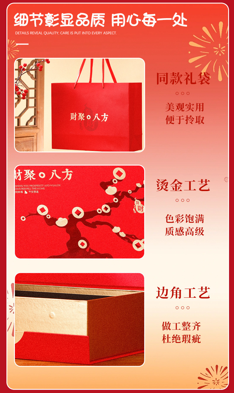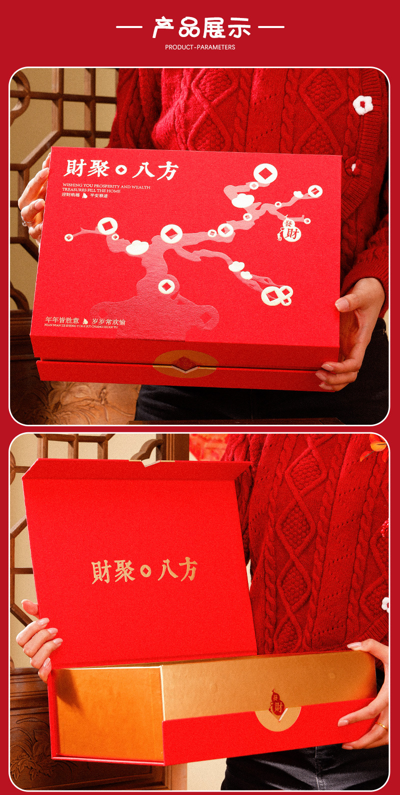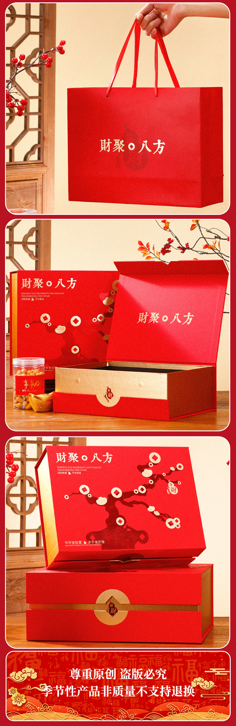 规格型号 财聚八方翻盖盒(小号);小号34*25*11.5㎝(空盒+礼袋送卡片),财聚八方翻盖盒(大号);大号37*30*14.5㎝(空盒+礼袋送卡片)