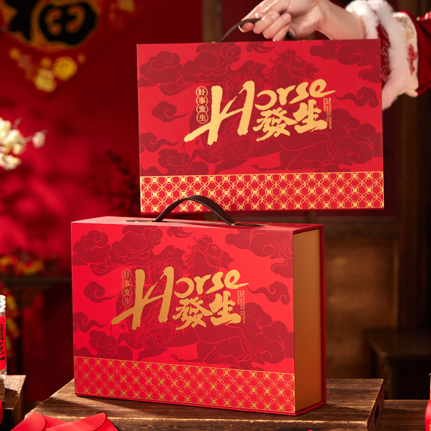 2026新年礼盒马年春节礼品盒喜庆翻盖手提包装盒大号零食特产空盒