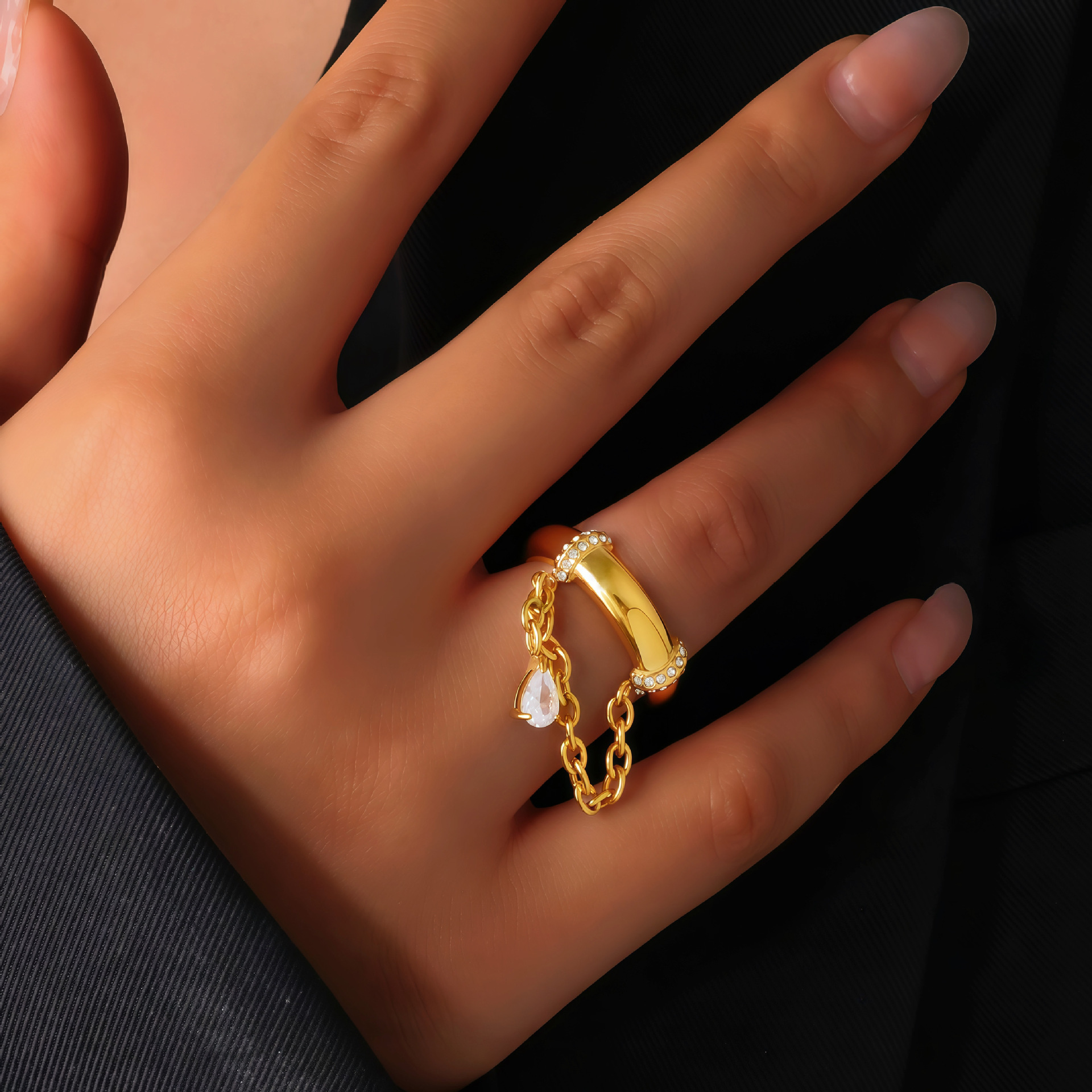 时尚精致链条水滴锆石戒指饰品钛钢首饰高级感百搭不褪色厂家直销