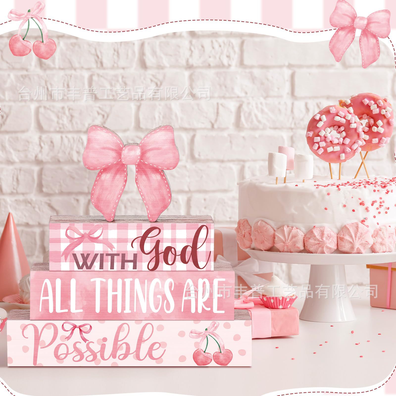 新款跨粉色蝴蝶结樱桃门挂壁饰女孩卧室墙壁装饰木质挂牌悬挂壁饰
