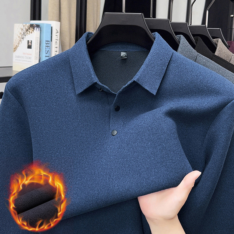 高端男士无痕加绒加厚长袖polo衫T恤秋冬翻领纯色休闲保暖打底衫