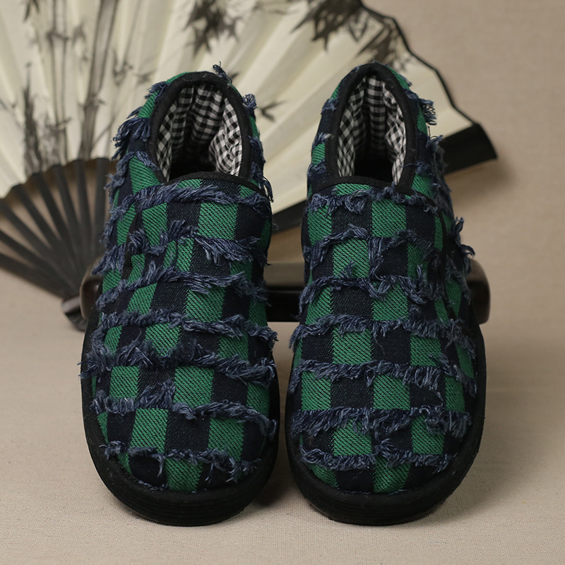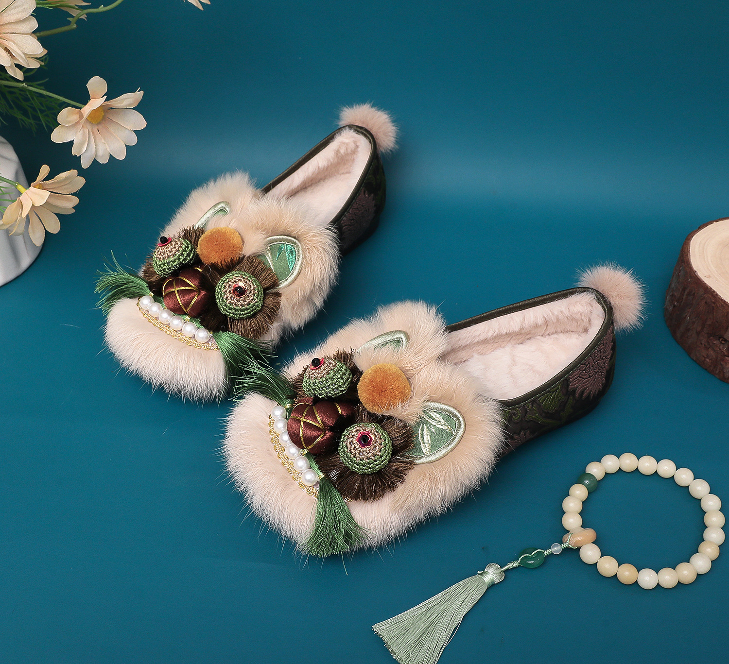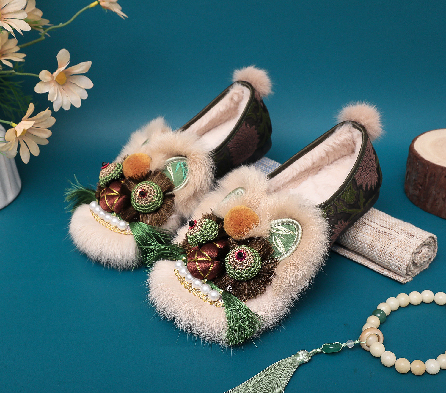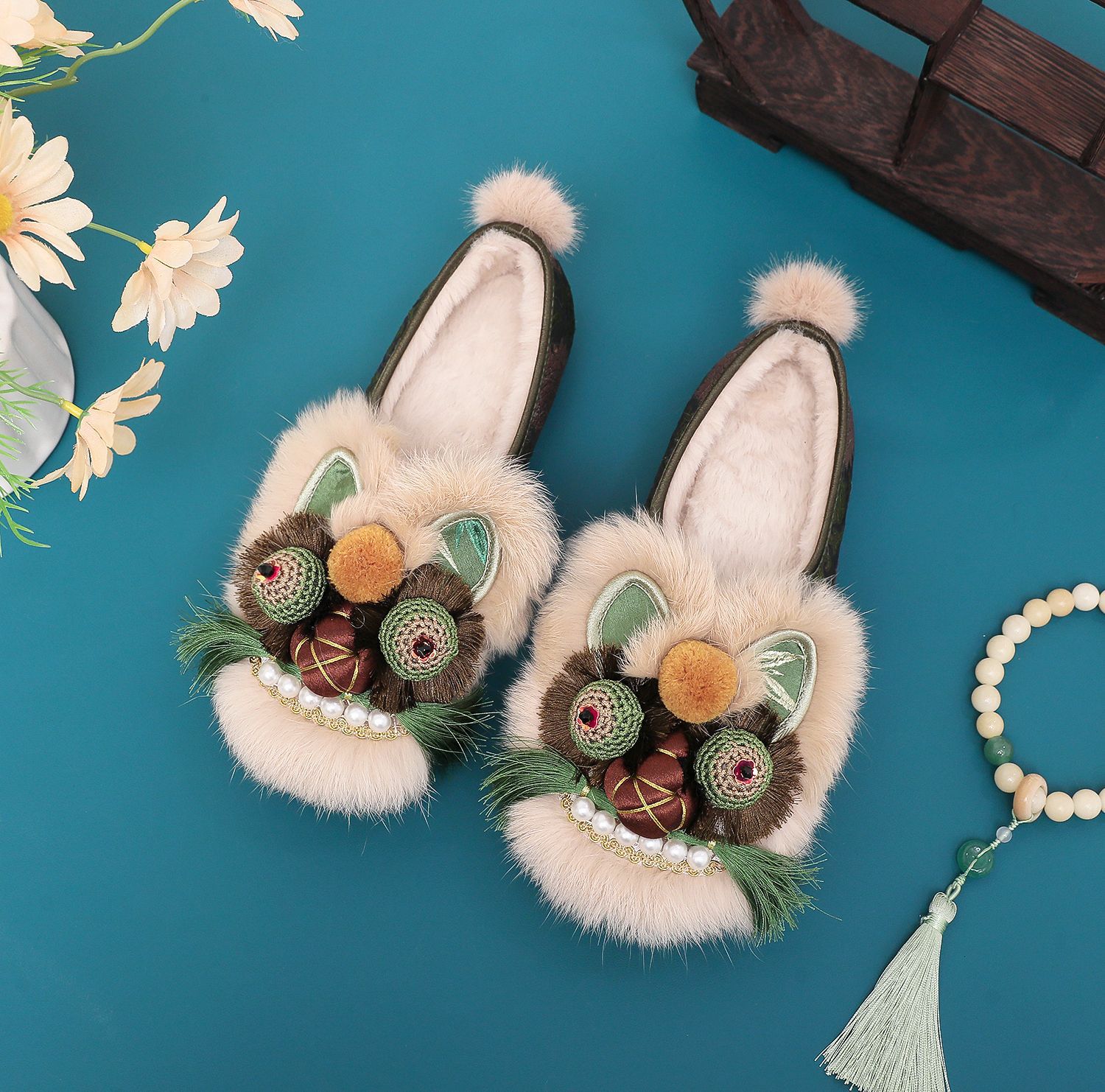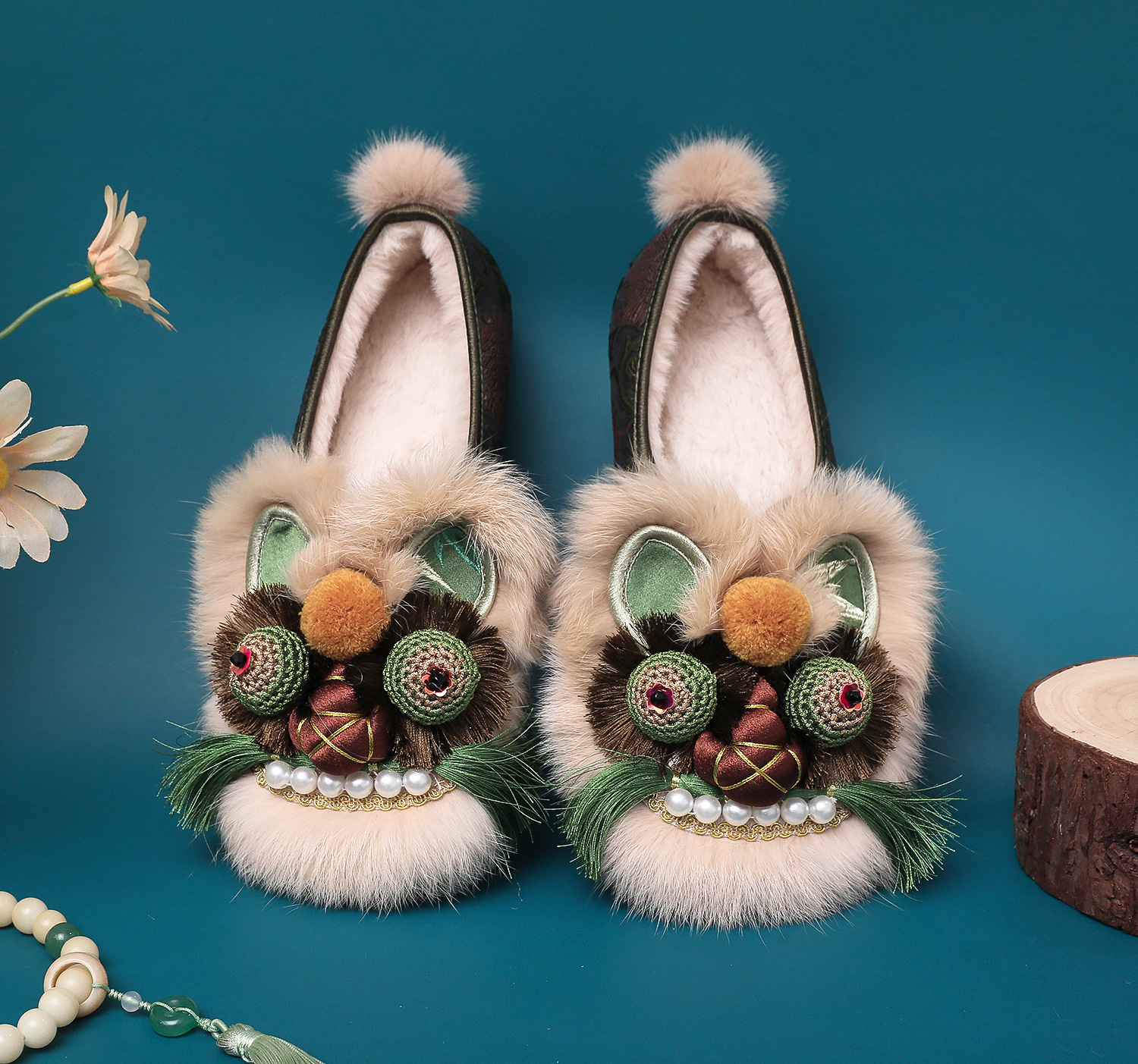 綿の靴の成人の虎の頭の靴の2024の新型の国潮の復古の民族の風の平底の女性の靴の民族の風の緑の葉