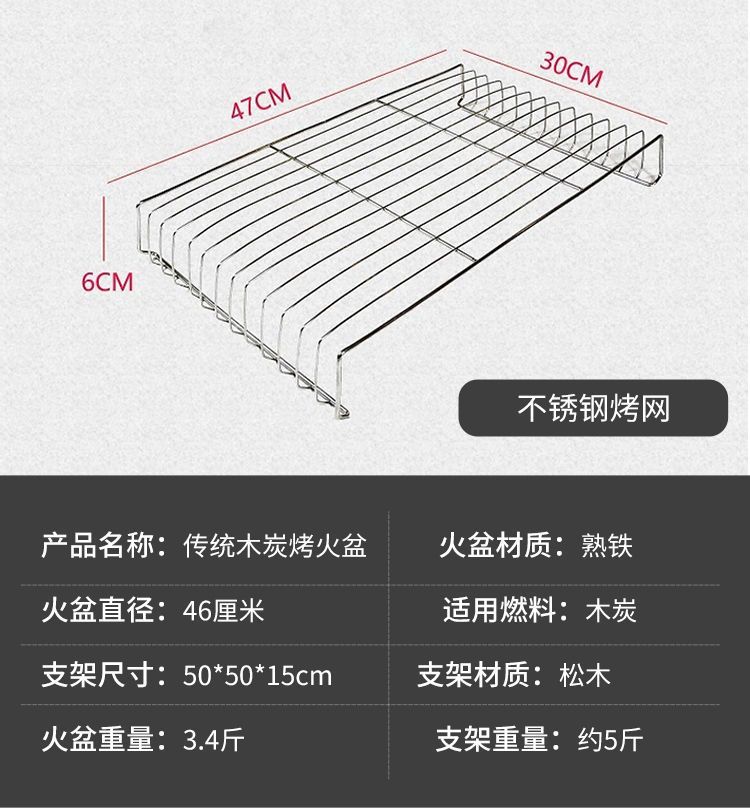 规格(长*宽*高) 50单层强化型加厚碳化木架,50木架+熟铁盆+碳夹子,50木架+熟铁盆+碳夹子+圆烤网,50木架+熟铁盆+夹子碳+方烤网,50木架+熟铁盆+夹+圆烤网+方烤网,50架+熟铁盆+夹+圆网+方网+锅架,50木架+铸铁盆+碳夹子,50木架+铸铁盆+碳夹子+圆烤网,50木架+铸铁盆+碳夹子+方烤网,50木架+铸铁盆+夹+圆烤网+方烤网,50架+铸铁盆+夹+圆网+方网+锅架,铸铁炭火盆,实用熟铁盆