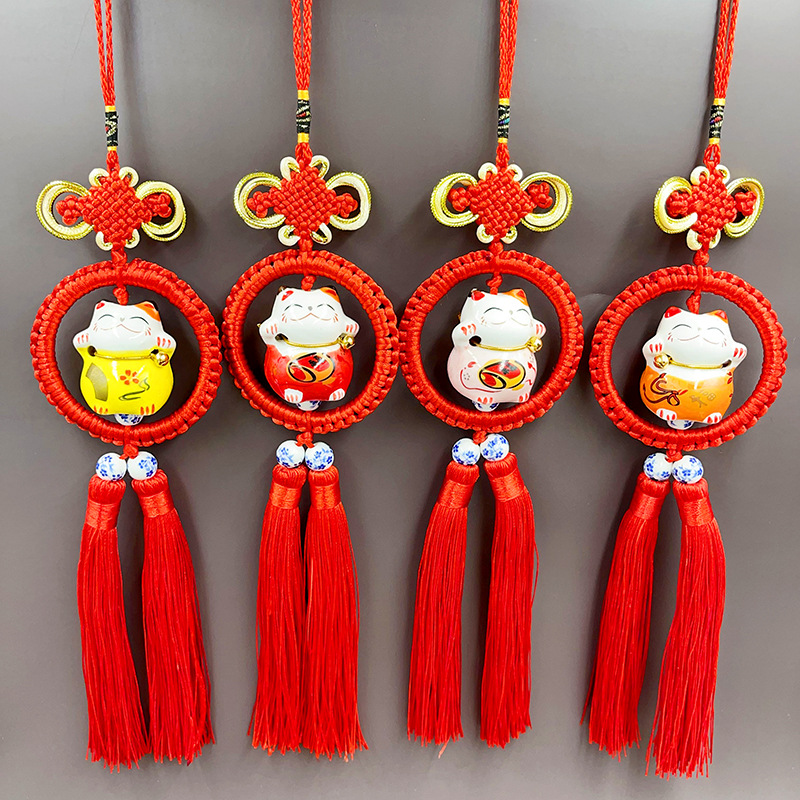 赤い中国の結び目セラミック招き猫タッセルペンダントホームカーデコレーションペンダント旅行のお土産小さなギフト