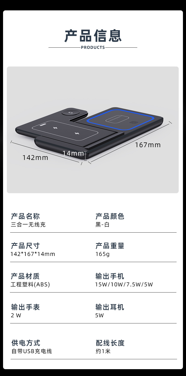 产品配置:三合一无线充+TypeC快充线(不含充电头)+说明书(6国)+合格证+中性包装