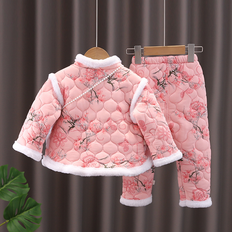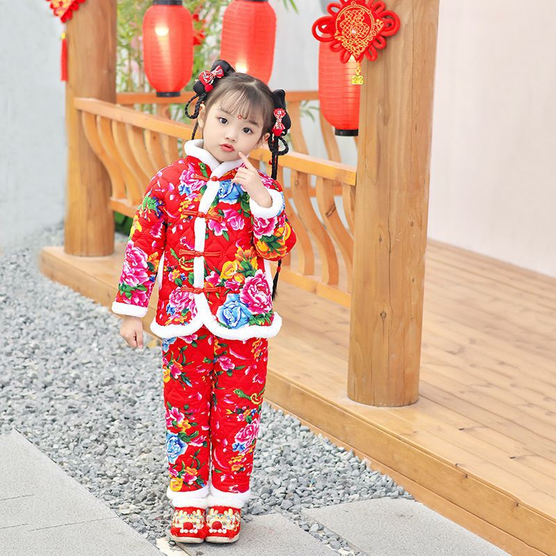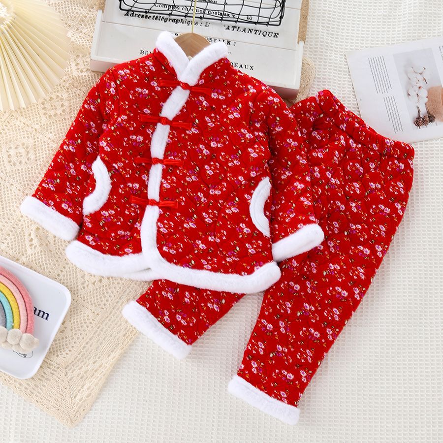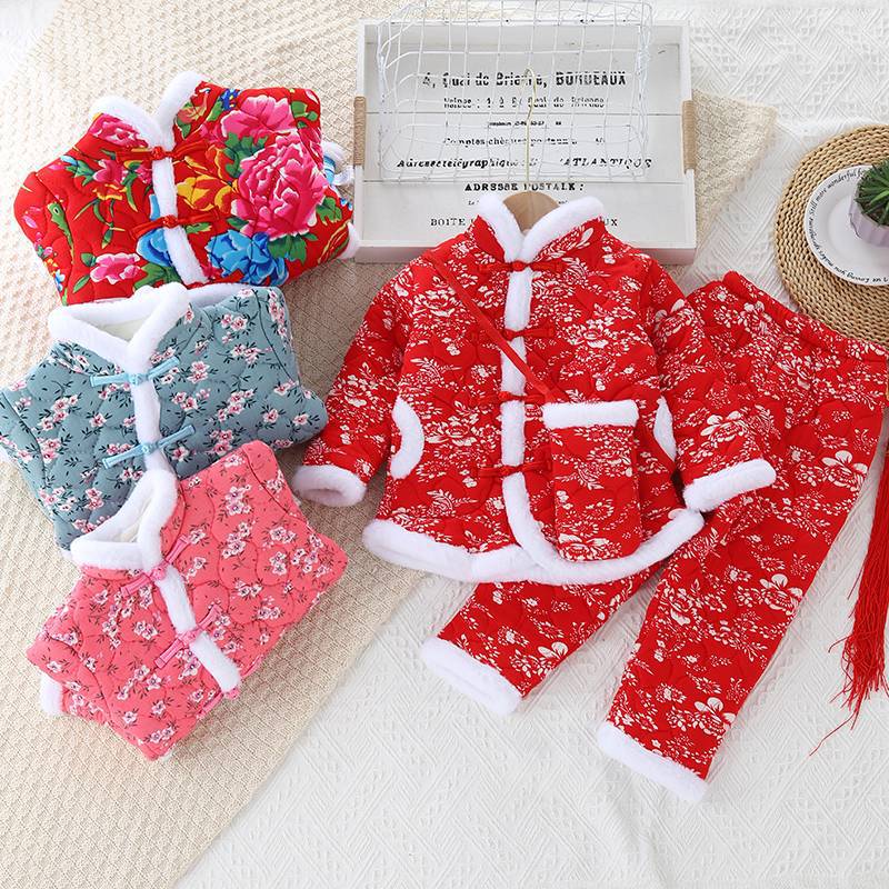 子供用綿服セット 中国風 中綿入り 厚手 ネット人気 大きな花柄 綿衣 綿ズボン 暖かい ベビー 厚手 正月服