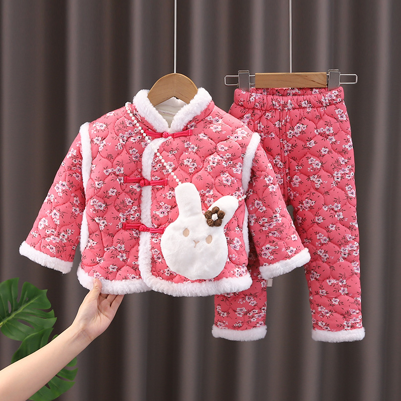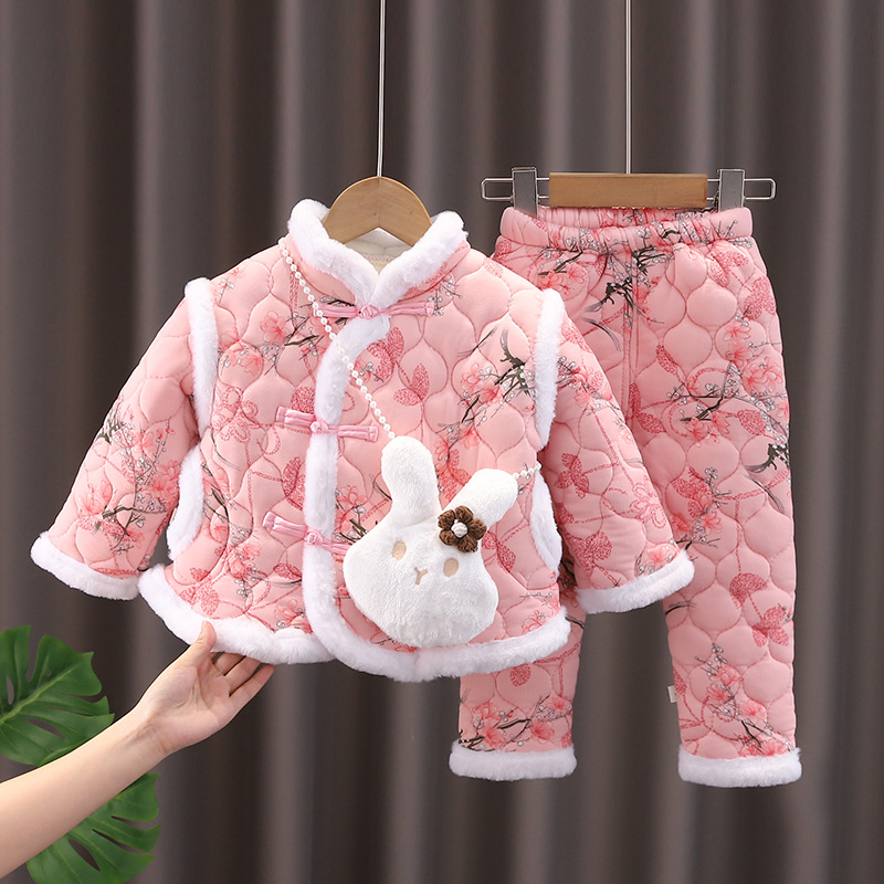 DJT女童东北大花棉袄冬女宝宝加绒加棉套装中国风加厚拜年服冬装