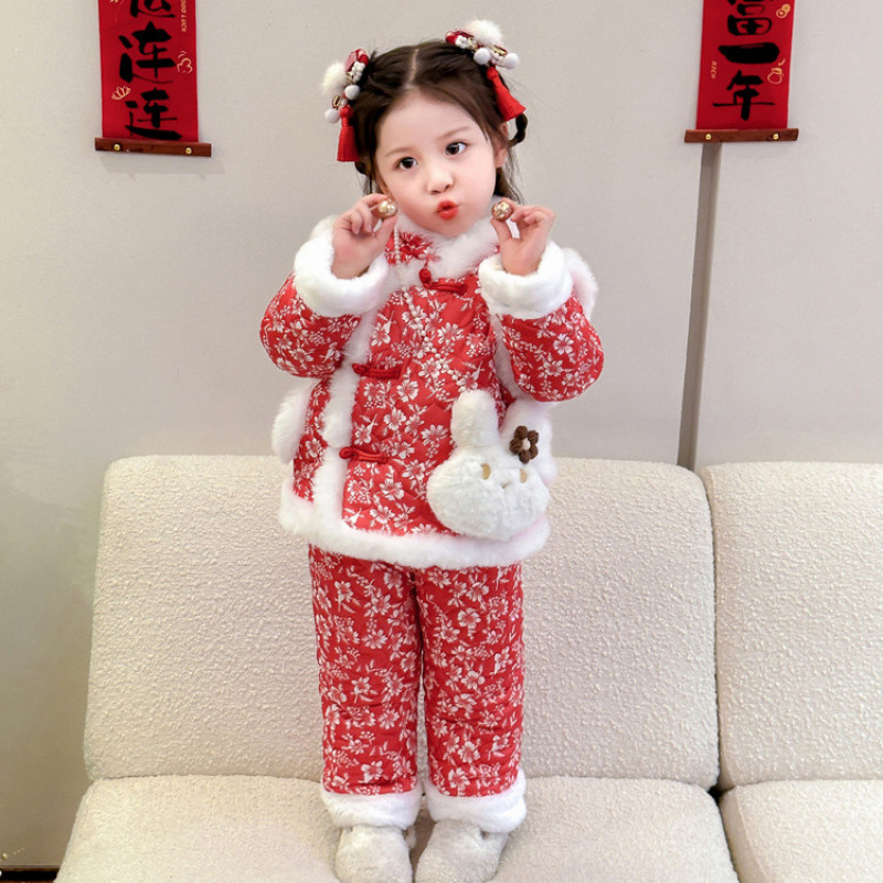 女童冬装套装2025新款儿童加绒加厚东北大花棉袄宝宝冬季棉衣年服