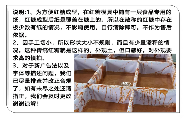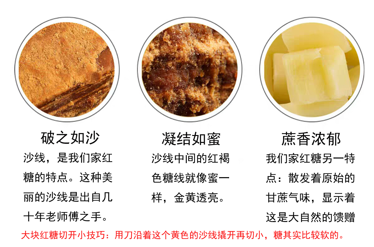 包装规格 5斤红糖【大块】蔗香蔗味,5斤红糖【切小】蔗香蔗味,2斤红糖[大块]蔗香蔗味,2斤红糖【切小】蔗香蔗味,3斤红糖[大块]蔗香蔗味,5斤深色红糖(黑糖),500g*1袋切小自封袋包装,500g*2袋切小自封袋包装,500g*3袋切小自封袋包装