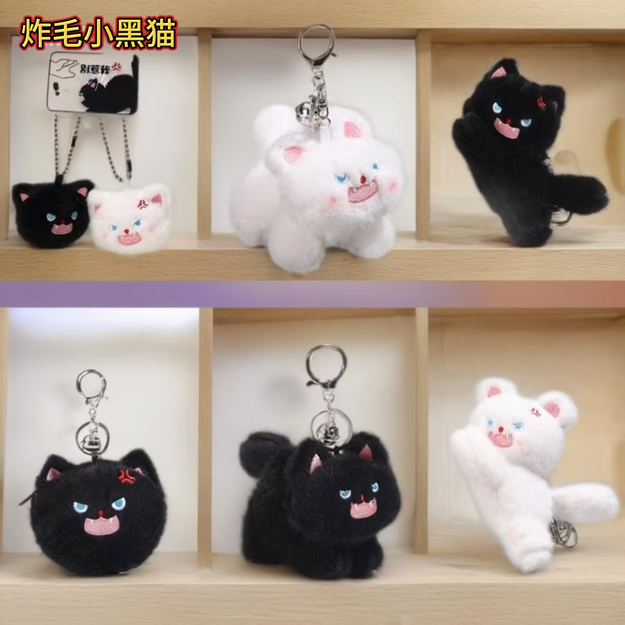 正版黑色炸毛猫猫钥匙扣女摇尾巴儿童毛绒玩具公仔包包挂件小饰品