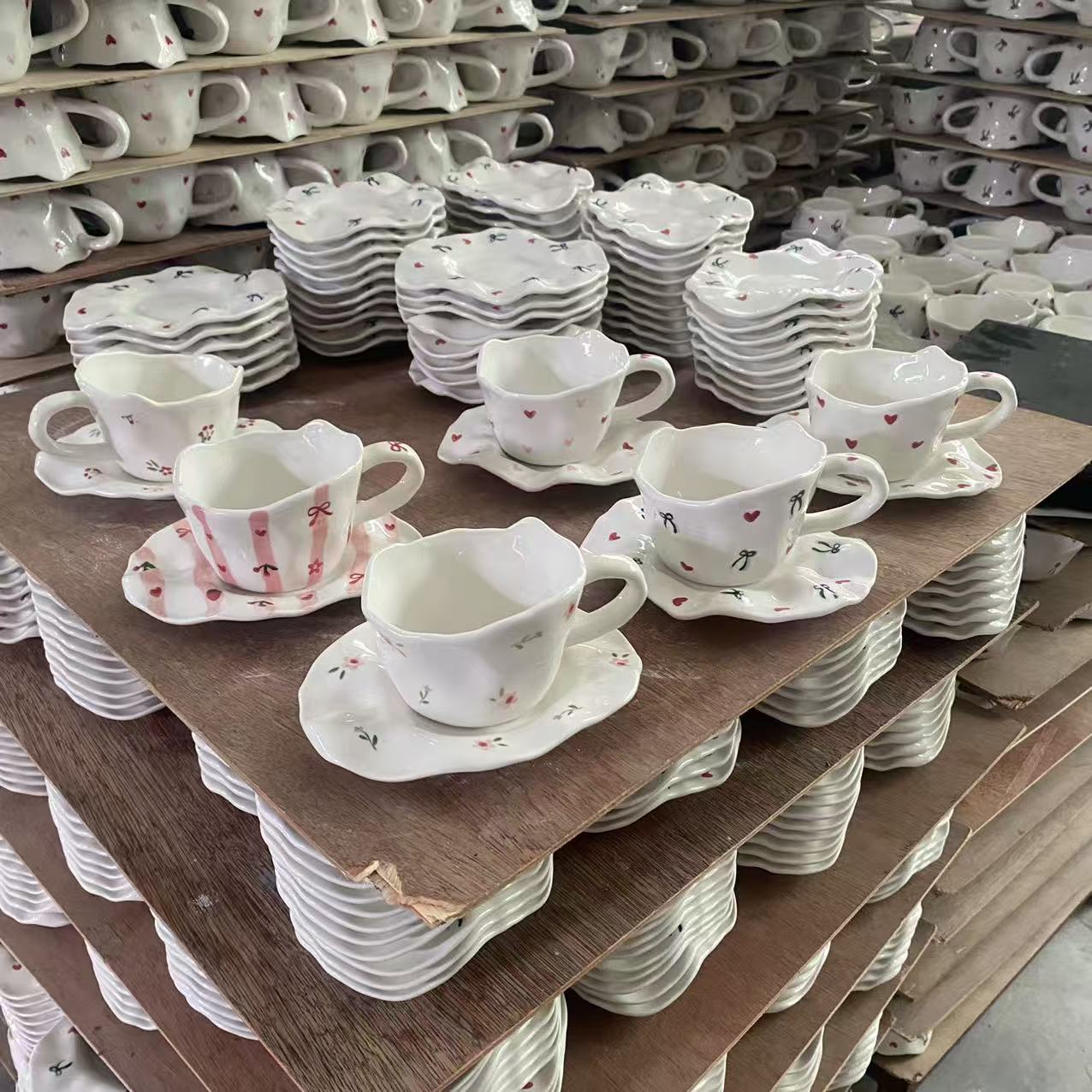跨境韩式ins风 手绘花朵陶瓷杯碟手捏不规则创意咖啡杯碟下午茶杯