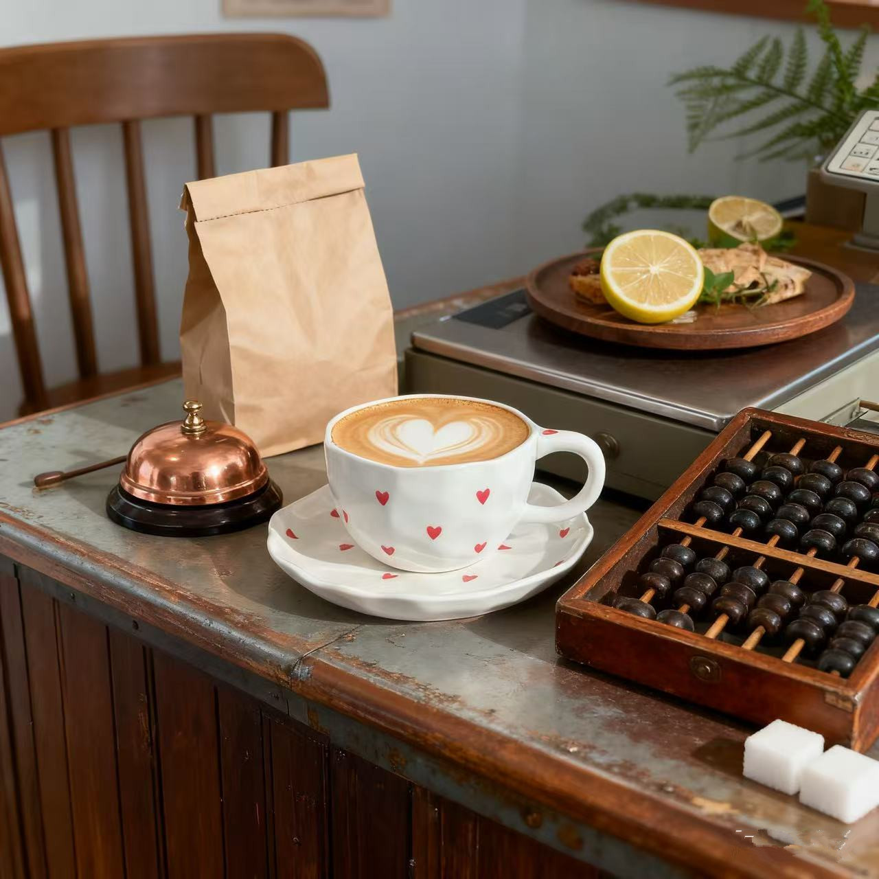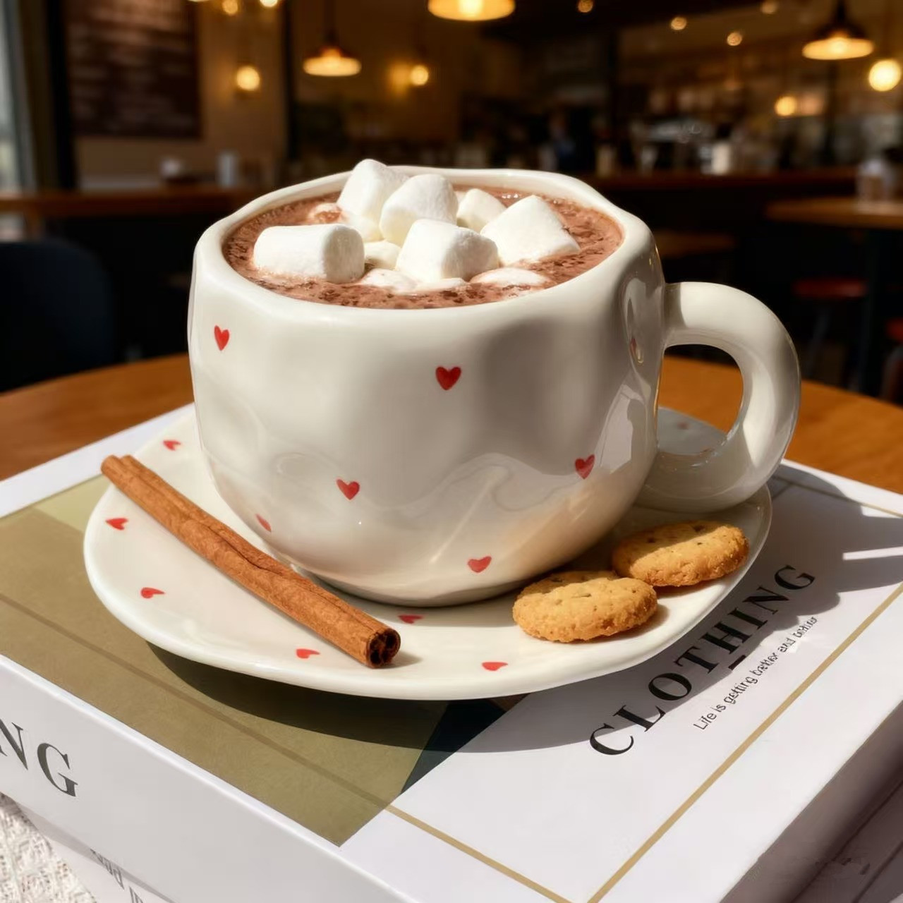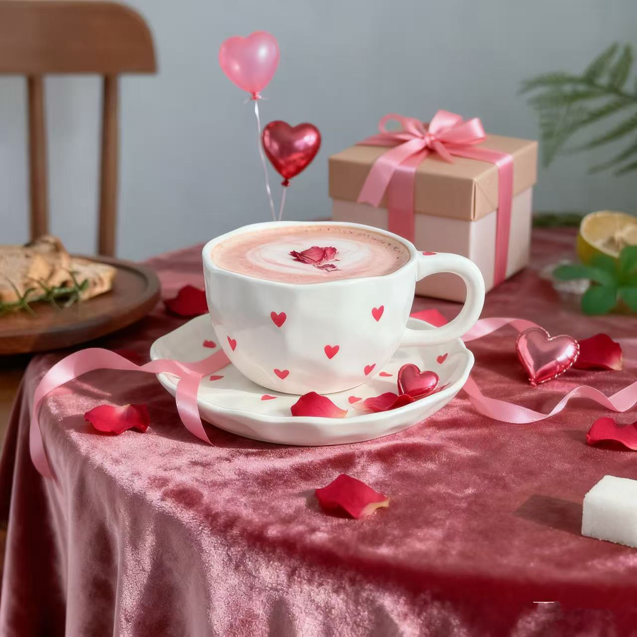 韓国風インスタ映え 手描きハート柄セラミックコーヒーカップ&ソーサーセット 不規則な形のクリエイティブな手捏ね小花柄マグカップ