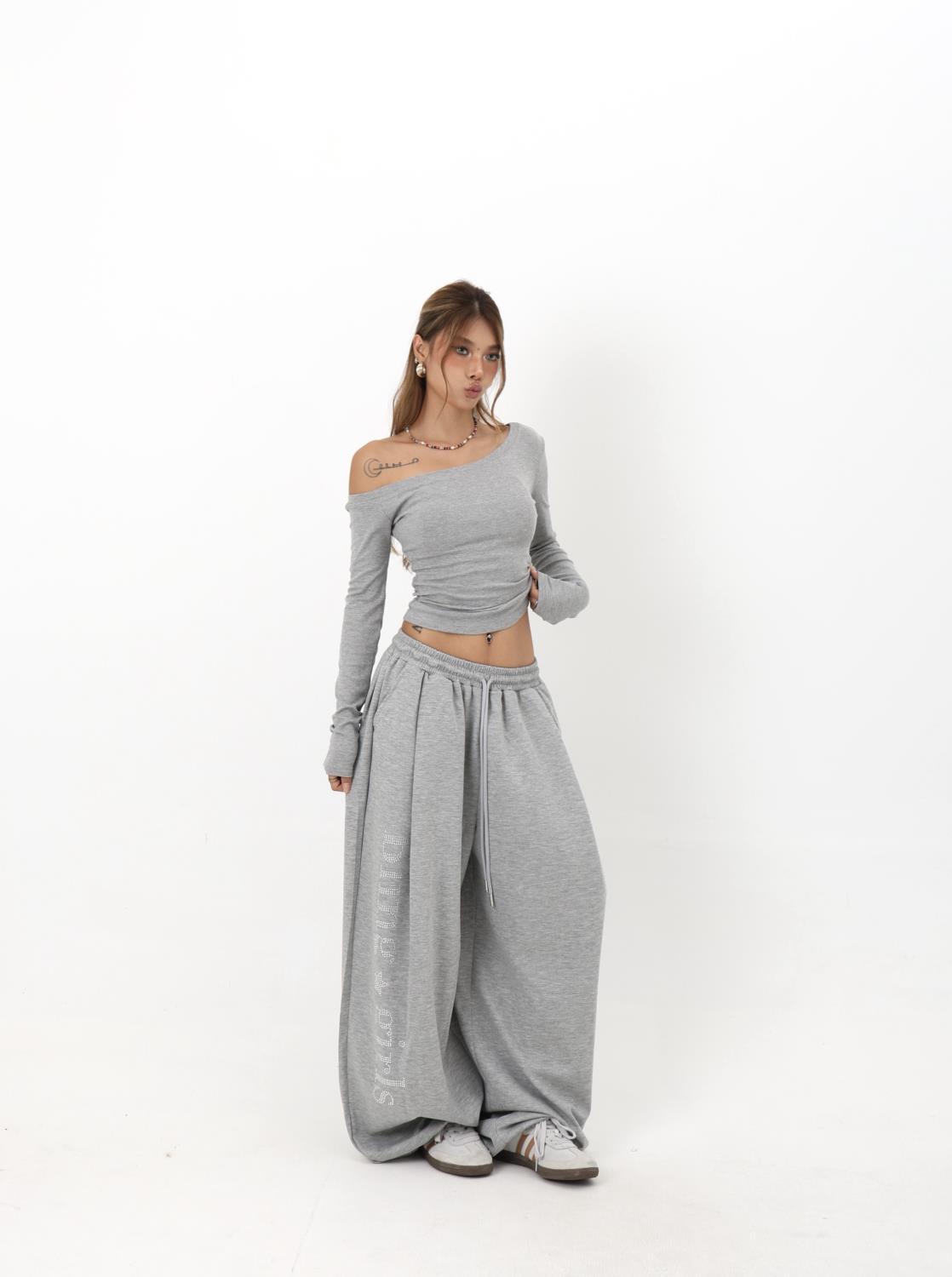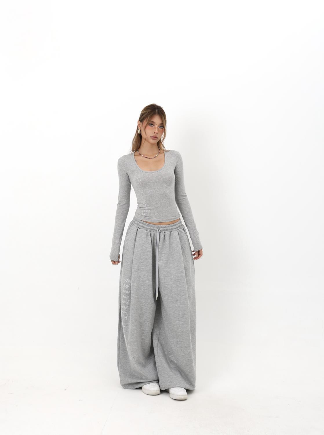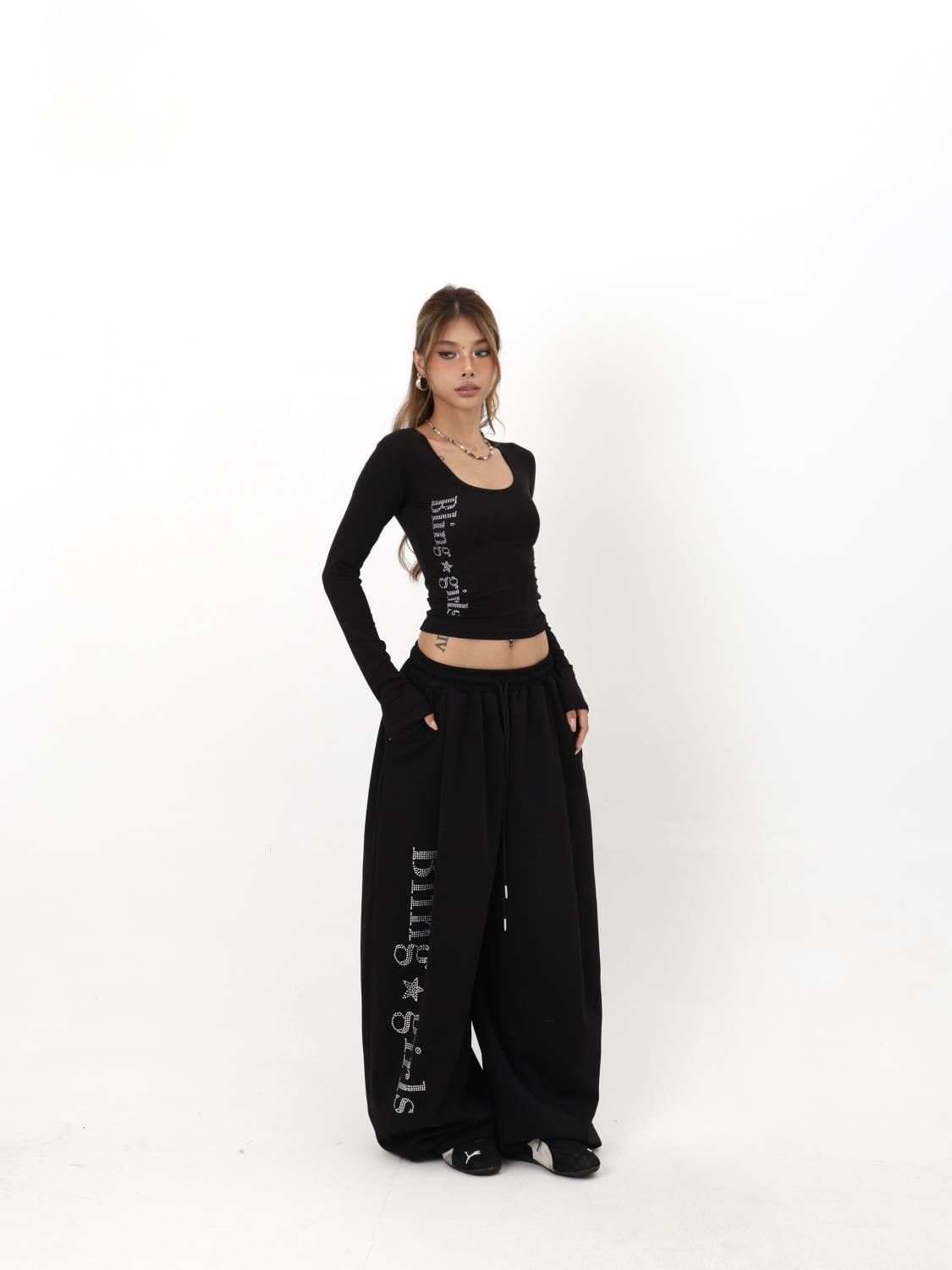 美式复古辣妹U领设计烫钻高弹修身纯色女秋款内搭长袖T恤打底上衣