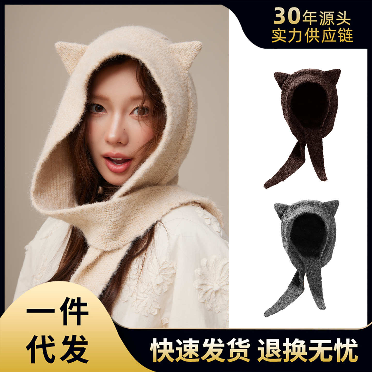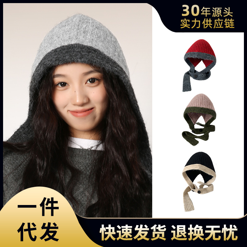 秋冬款巴拉克拉法帽女羊毛混纺保暖披肩一体帽混色百搭针织斗篷帽