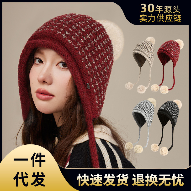 可爱毛球针织帽女秋冬时尚显脸小毛线帽含羊毛保暖防风护耳雷锋帽