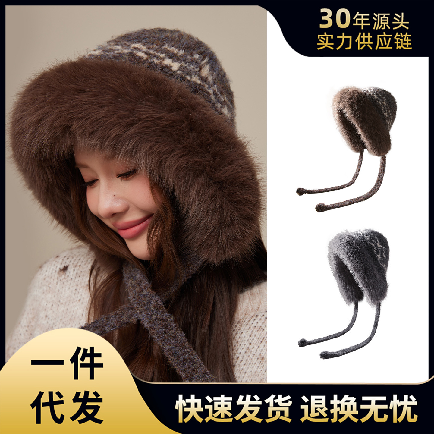 韩版加厚护耳毛线帽女秋冬季费尔岛羊毛混纺针织帽保暖毛绒雷锋帽