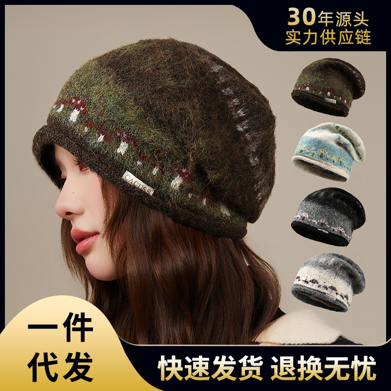 费尔岛风卷边堆堆帽女秋冬羊毛混纺毛线帽复古显脸小慵懒风针织帽
