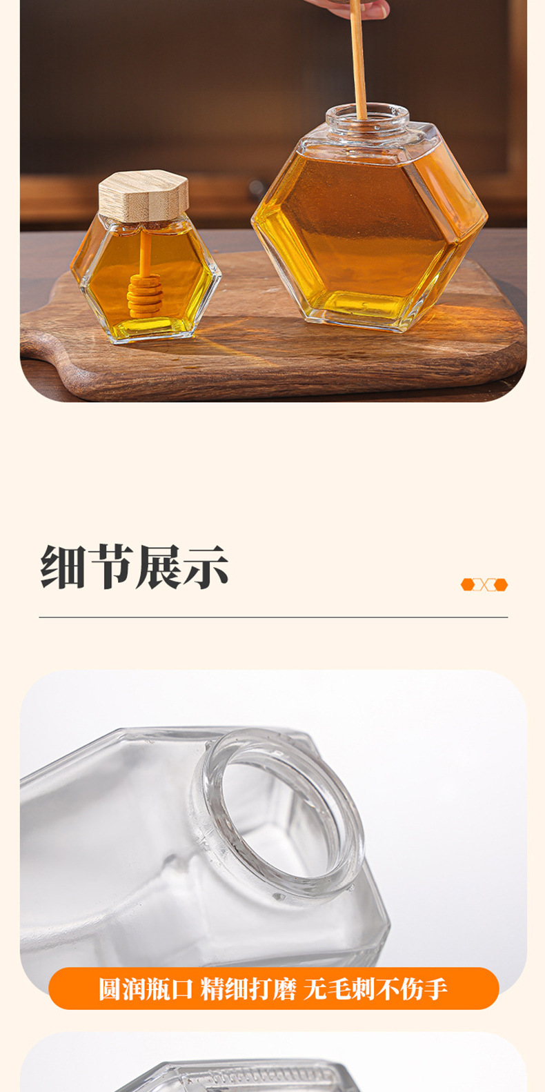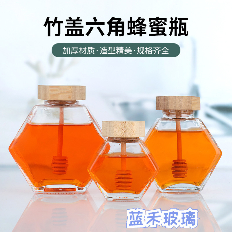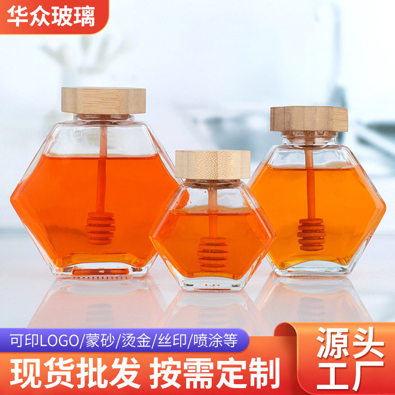 竹木盖玻璃蜂蜜瓶子密封装空瓶六角果酱瓶玻璃罐现货批发带搅拌棒