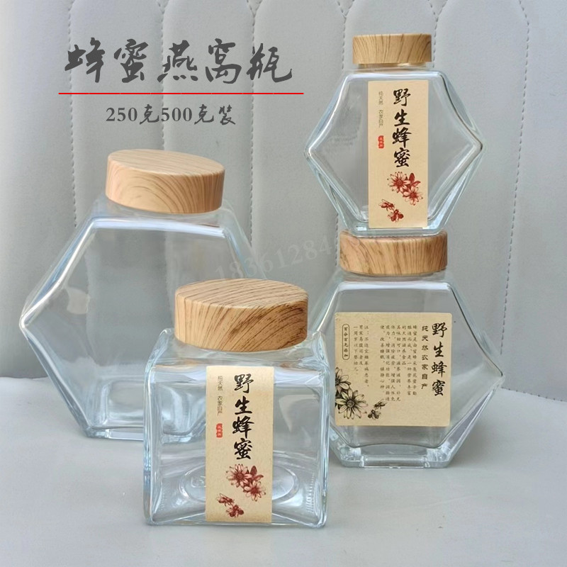 卸売り六稜蜂蜜瓶透明木目蓋ガラス漬物瓶ジャム密封瓶厚いツバメの巣分注瓶