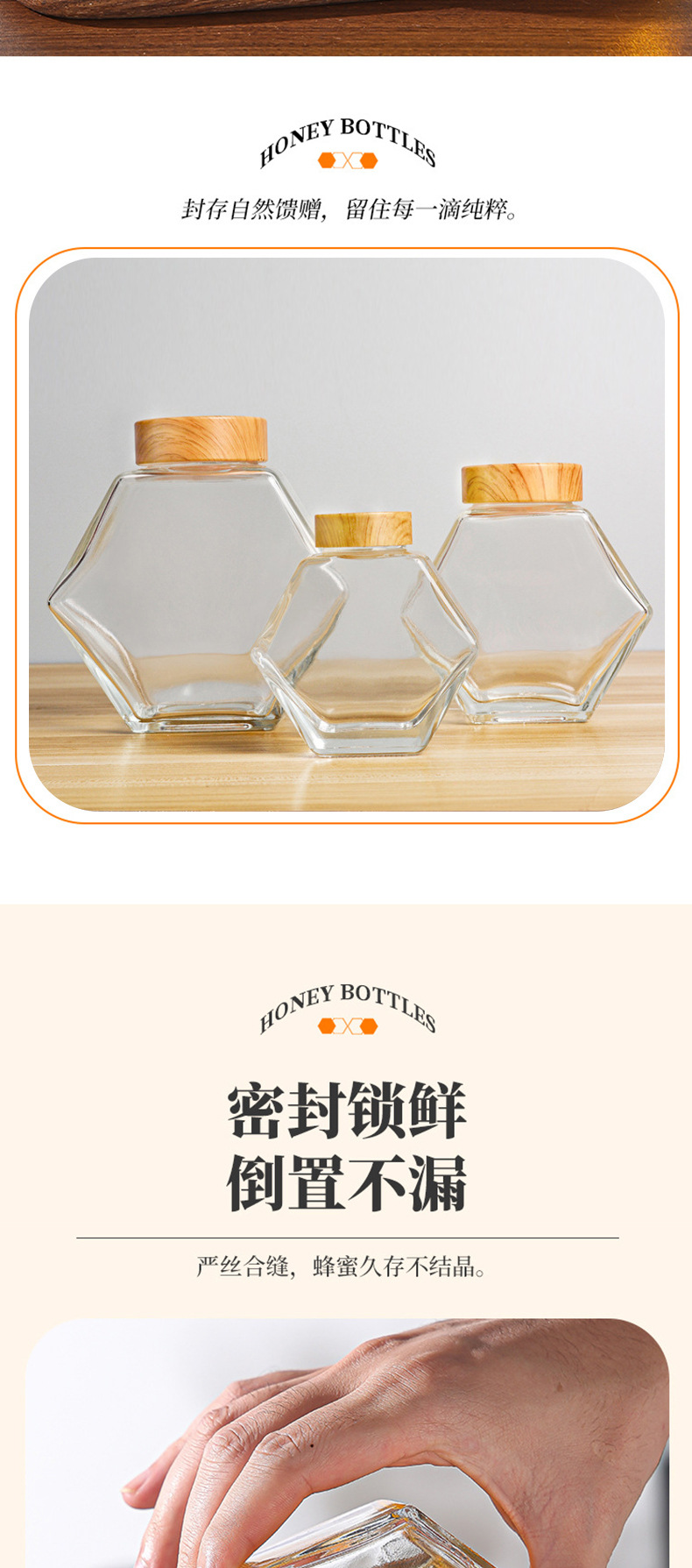 六边形玻璃蜂蜜瓶透明加厚密封木纹盖秋梨膏分装空瓶360ml果酱瓶