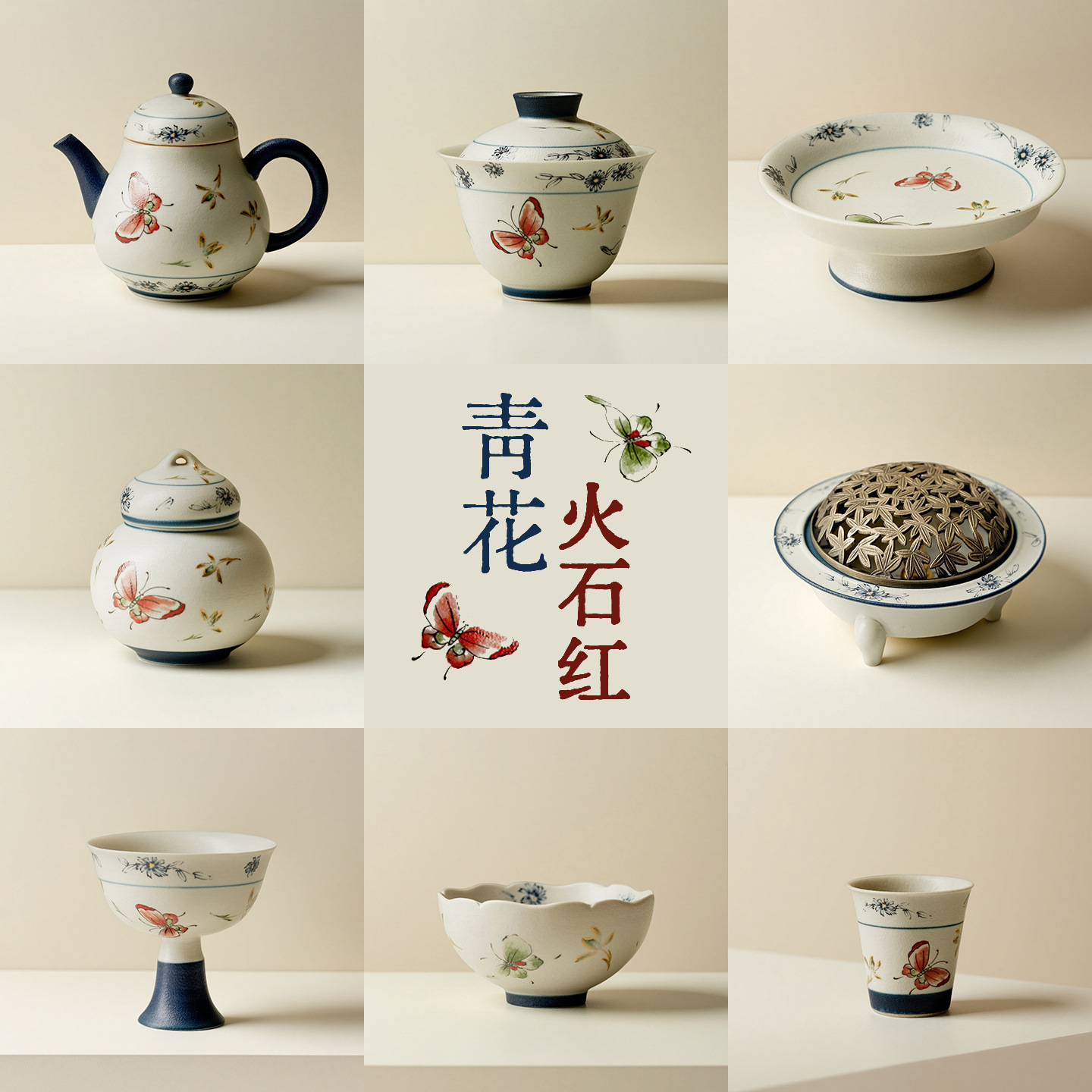 墨己青花火石红描金蝴蝶兰花仿古茶具合集功夫茶具茶壶盖碗茶杯