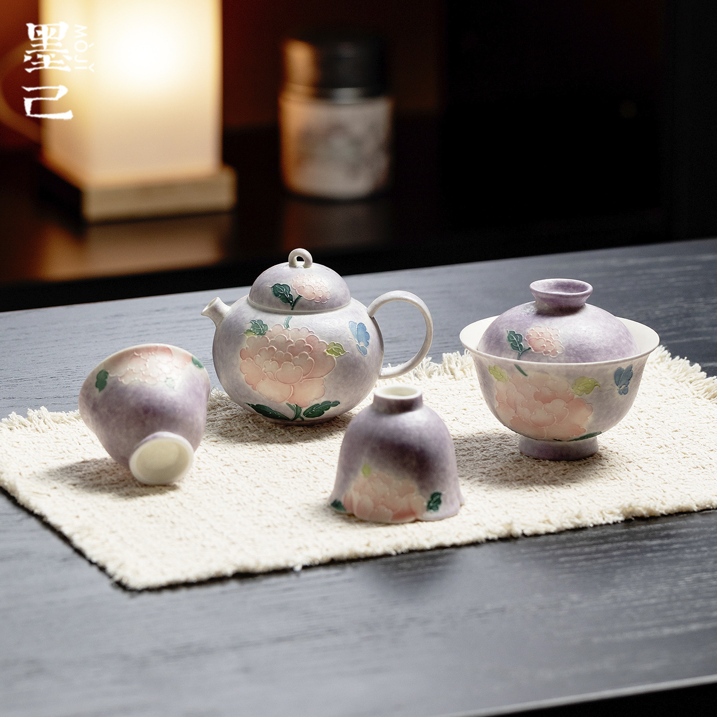 墨己洒紫牡丹蝴蝶手绘陶瓷茶具新中式家用功夫茶具茶壶盖碗茶杯