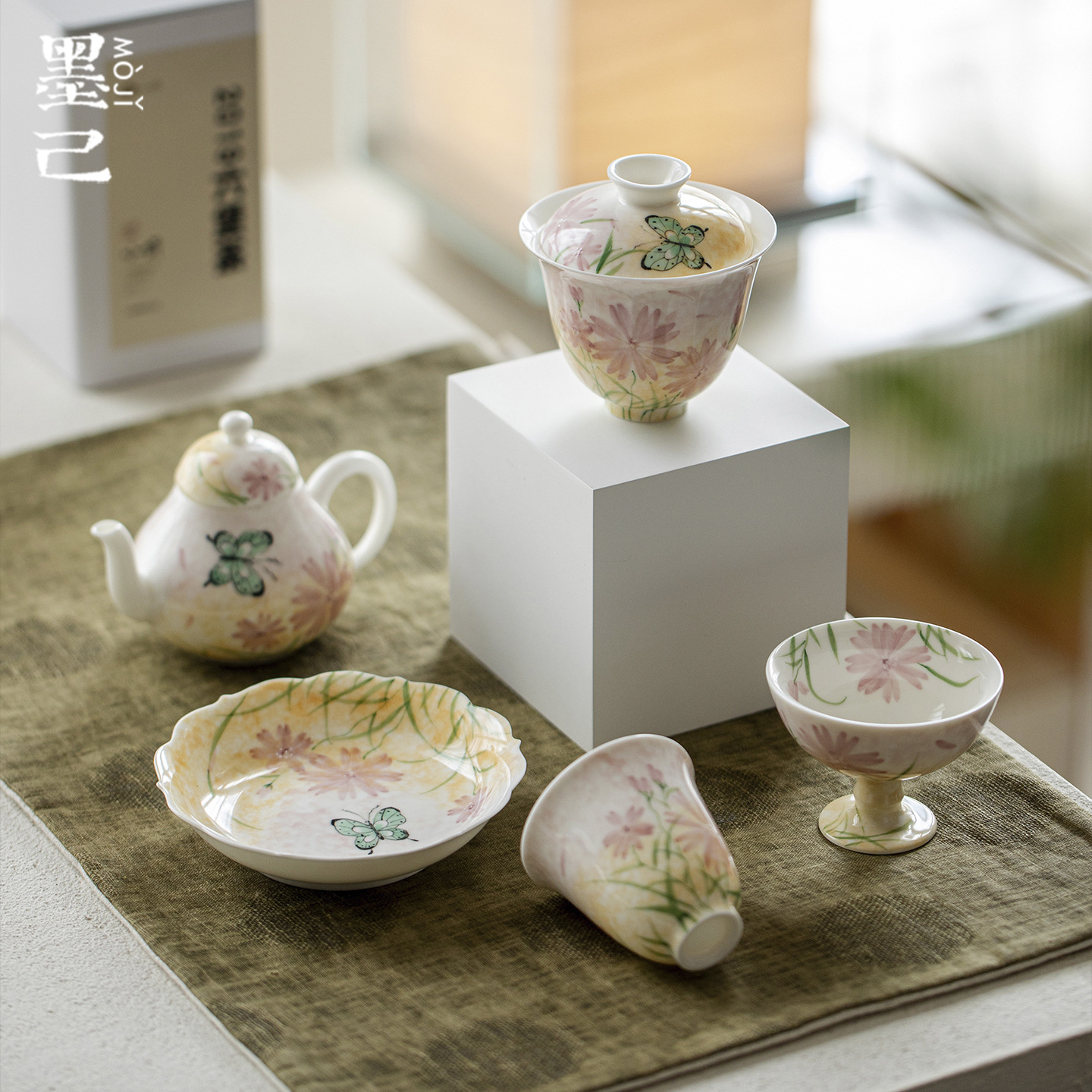 墨己油画风晕染手绘梦蝶吻粉陶瓷茶具合集茶壶盖碗壶承主人杯茶杯