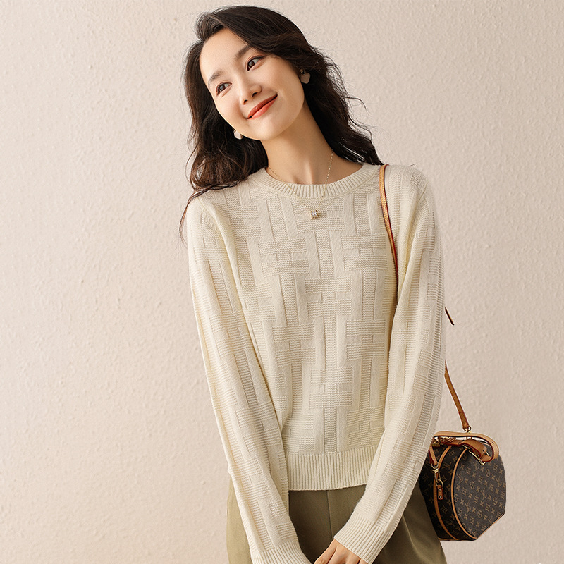 秋冬ニットウールセーター、秋と冬のラウンドネック長袖Hテクスチャープルオーバーセーター、ミドル丈