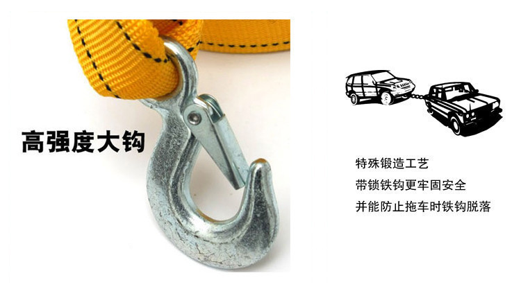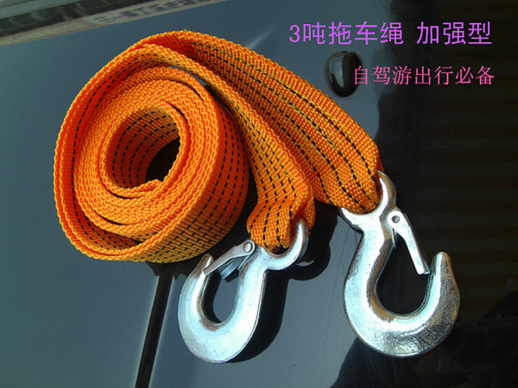 这时,你一定需要拖车绳将车拖离抛锚地点,加厚型拖车带选用加固质材具有5吨的承受能力,并经过特别工艺处理,能防止及减少拖车时两车间的振动,锻造带锁铁钩更牢固安全,并能防止拖车时铁钩脱落,为您行车应急时增添一分安全。