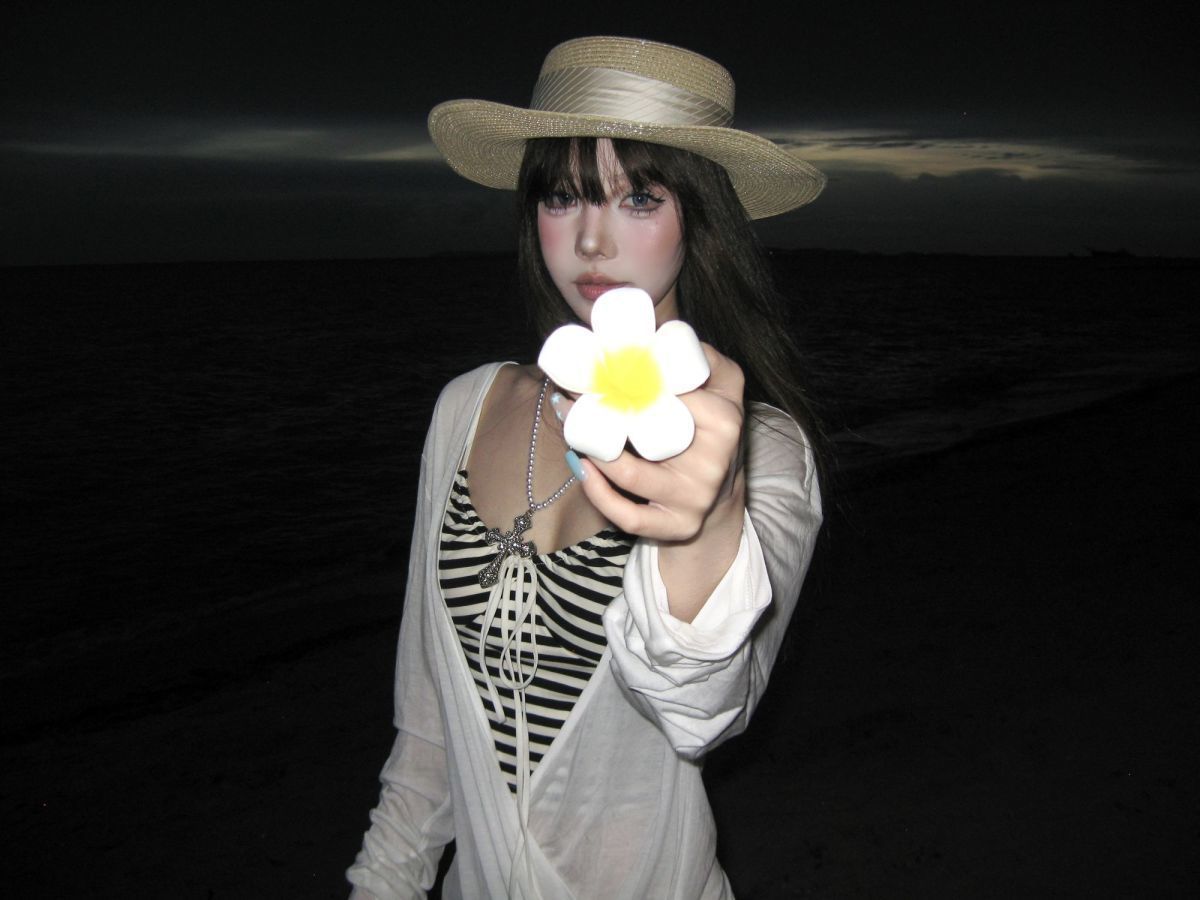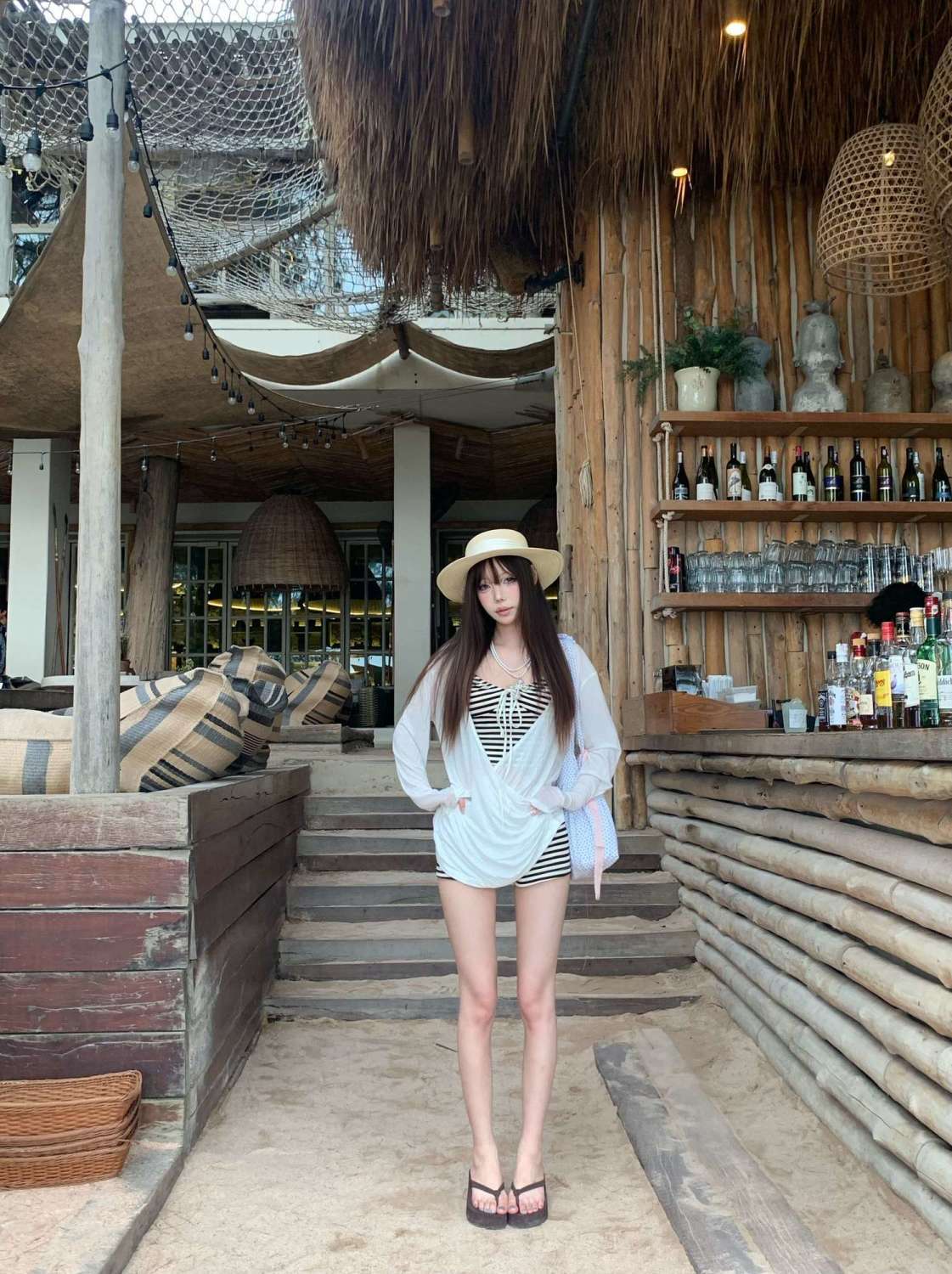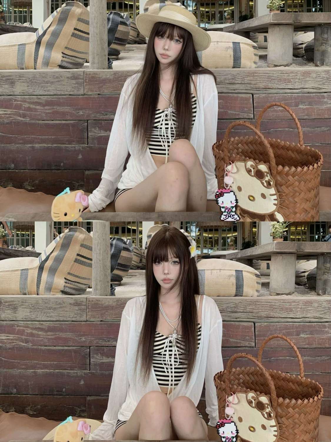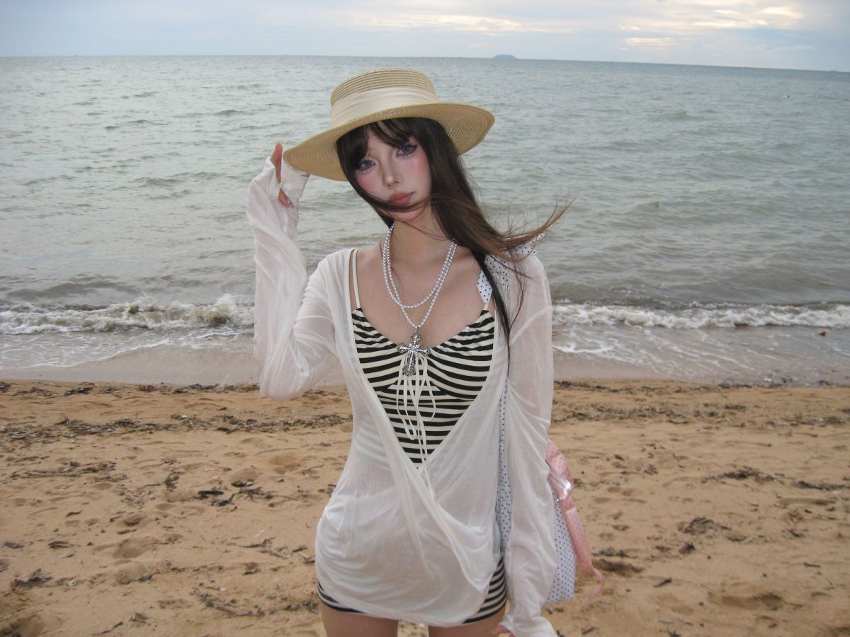 高颜值拍照慵懒纯欲长袖罩衫防晒比基尼条纹分体泳衣海岛度假温泉