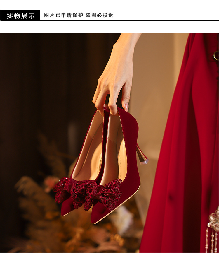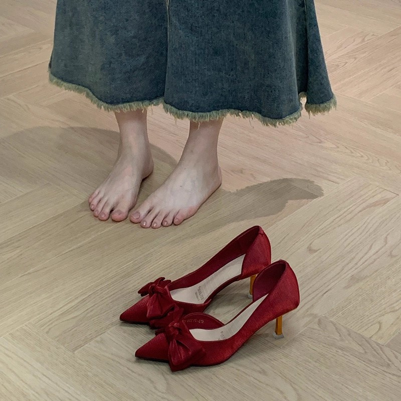 巨好穿~红色高跟鞋2025年新款女侧空蝴蝶结秀禾婚鞋新娘鞋不累脚
