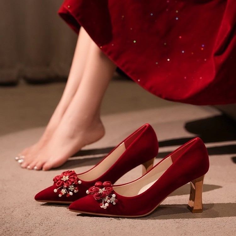 红色婚鞋女粗跟珍珠结婚新娘鞋2025秋季新款高跟订婚秀禾婚纱单鞋