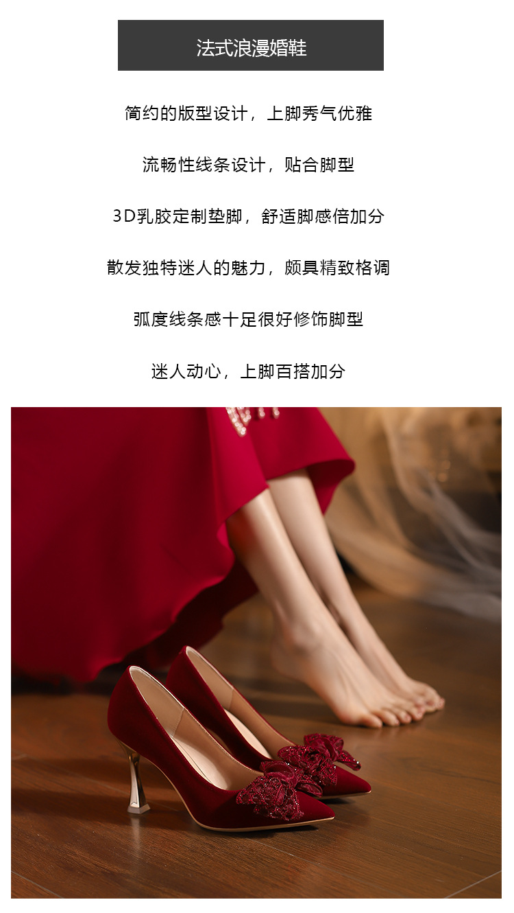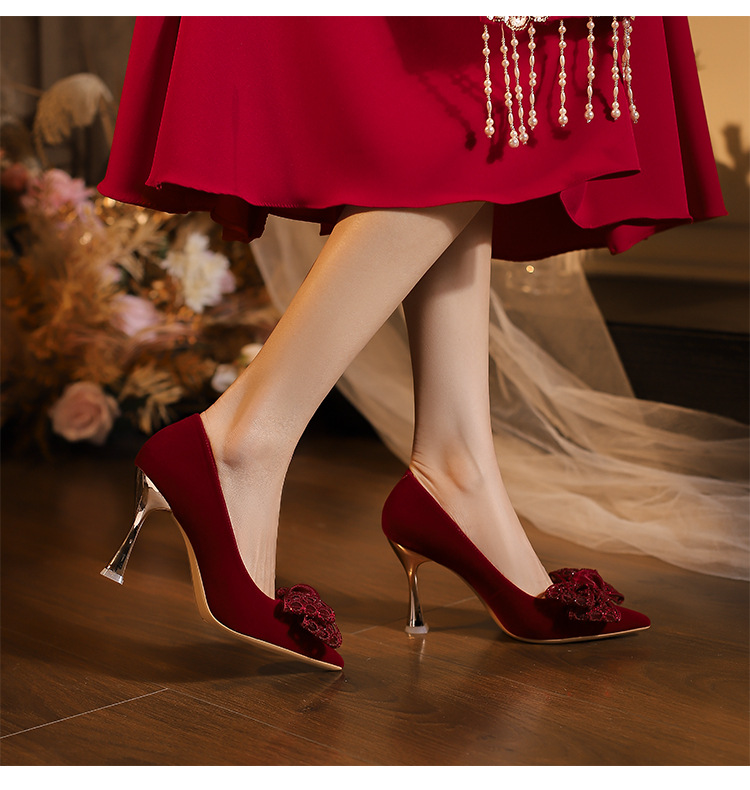 红色高跟鞋婚鞋女2025年秋季新款尖头细跟刺绣蕾丝秀禾婚纱新娘鞋