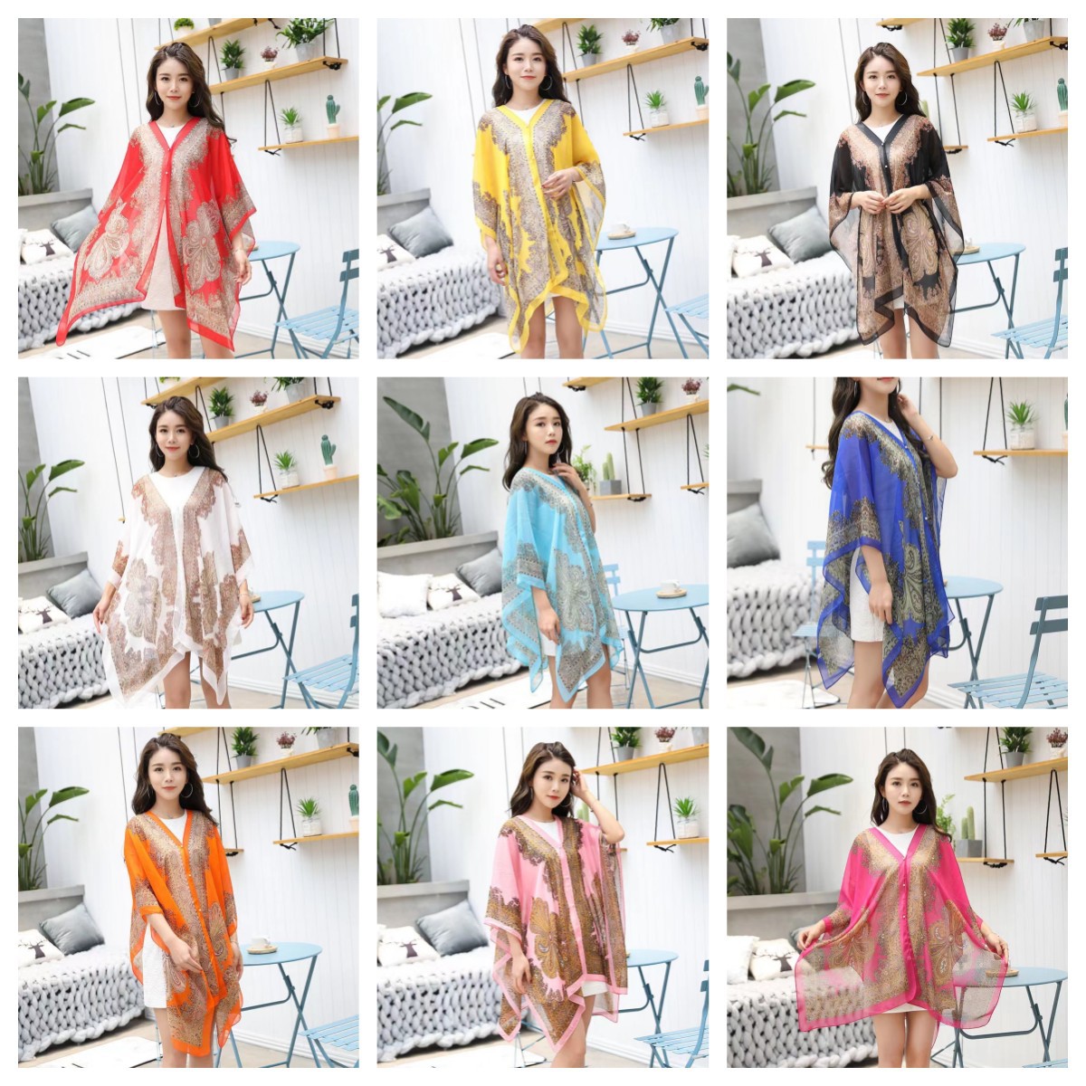 夏のシルクタオル日焼け止めストール女性腰果プリント釘珠真珠ボタン雪紡織シルクタオル超薄いビーチタオル女性