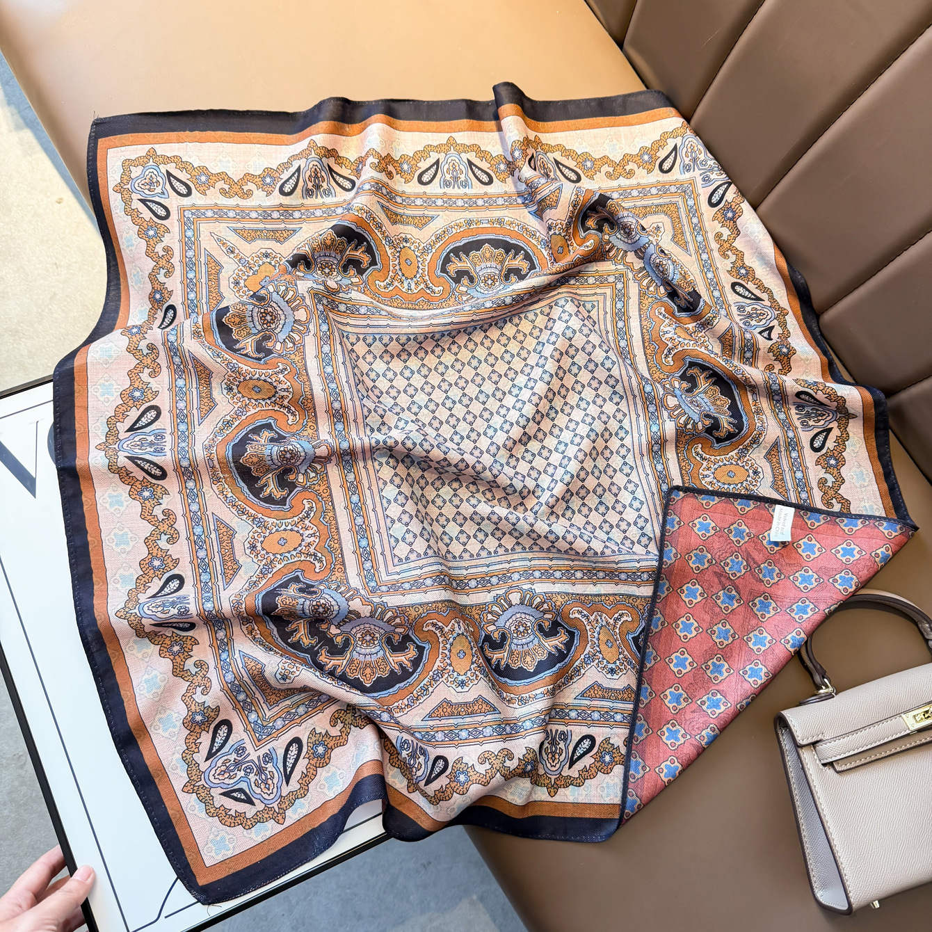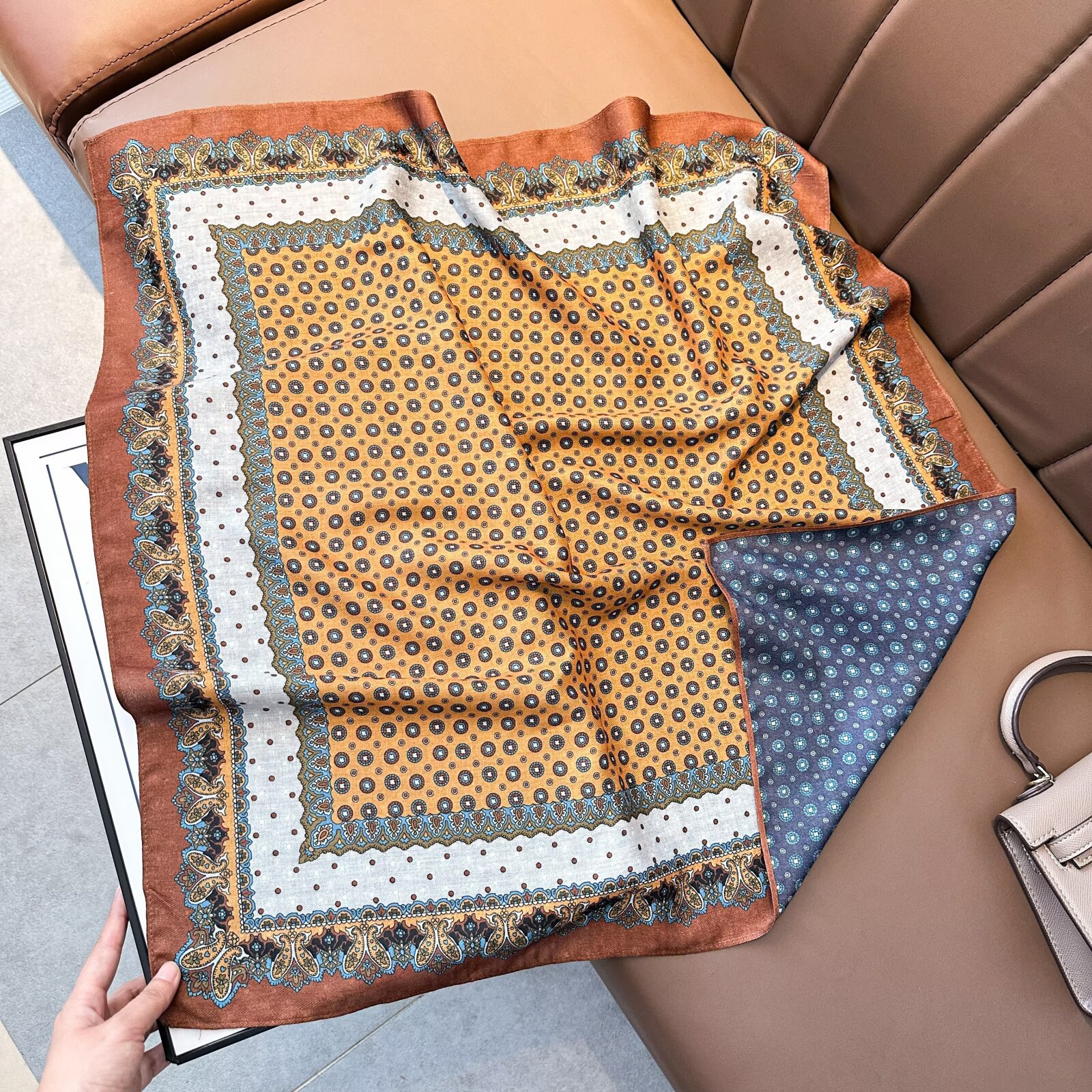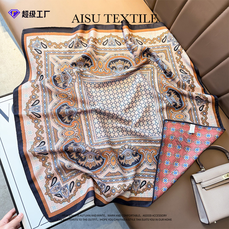轻奢腰果花丝巾高级感复古小方巾70人字纹几何双面印花丝巾领巾女