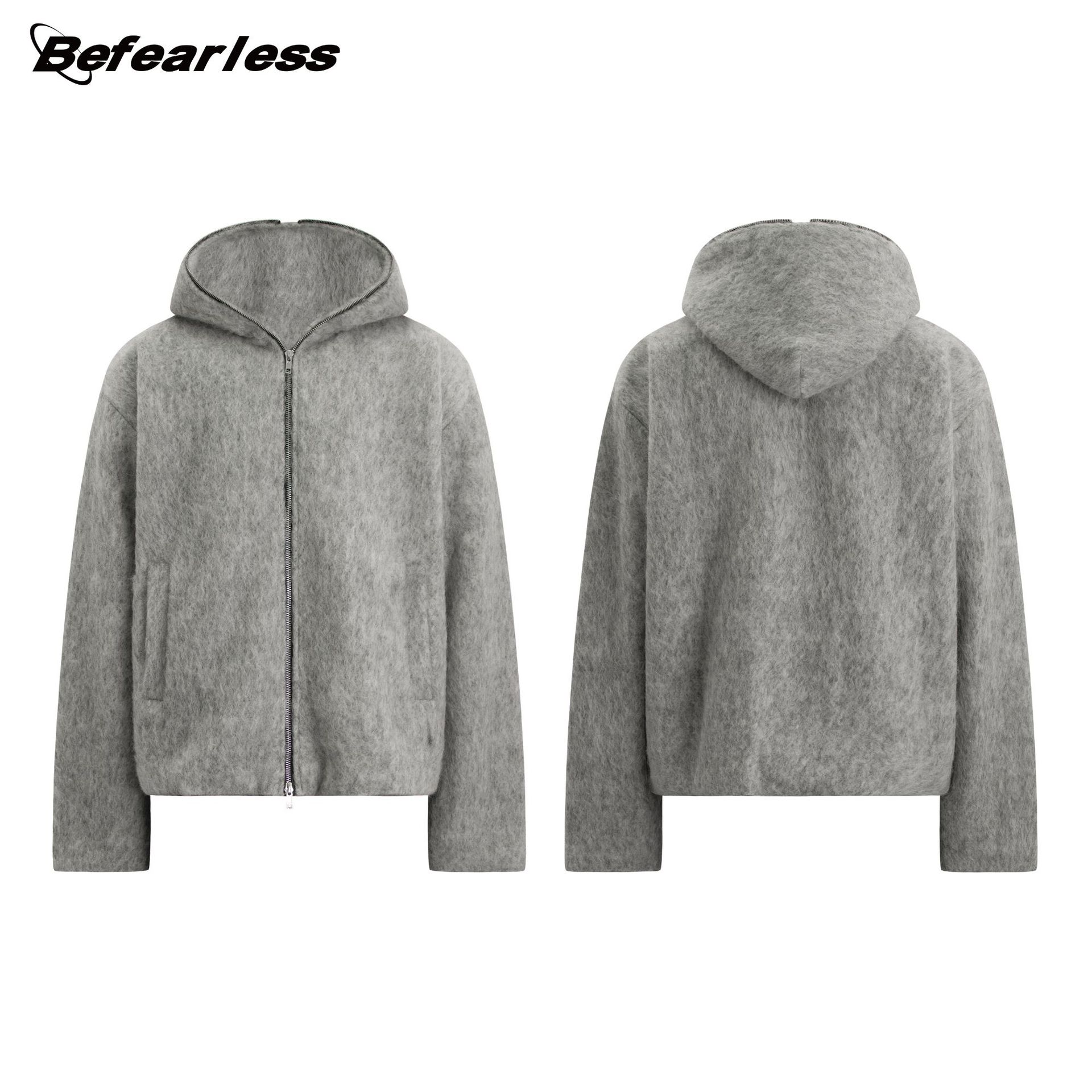 美式复古重磅海马毛全拉链连帽夹克男女潮牌氛围感羊毛短宽外套