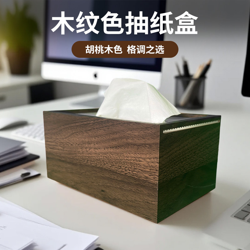 胡桃木纹新中式纸巾盒客厅餐桌办公室桌面高档抽纸盒中古风收纳盒