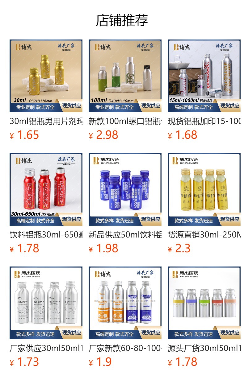 规格 30ml 银色铝裸瓶,50ml 银色铝裸瓶,60ml 银色铝裸瓶,80ml 银色铝裸瓶,100ml 银色铝裸瓶,120ml 银色铝裸瓶,150ml 银色铝裸瓶,200ml 银色铝裸瓶,250ml 银色铝裸瓶