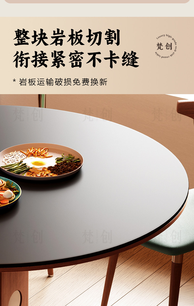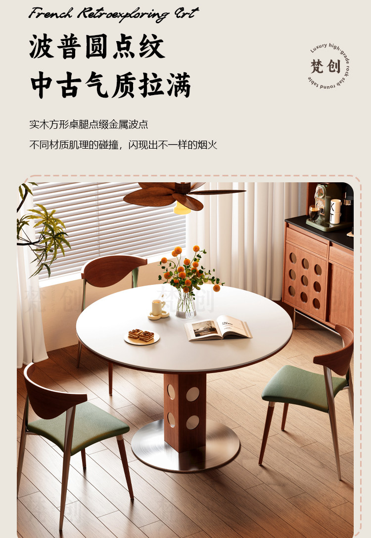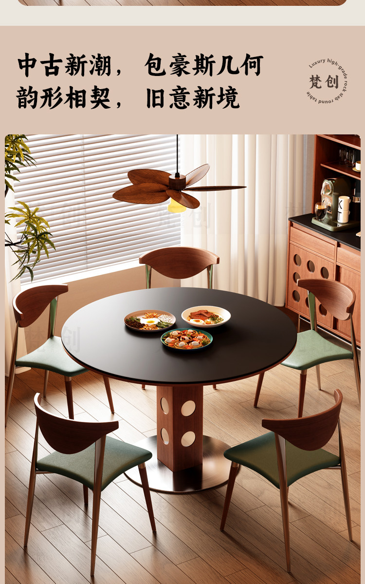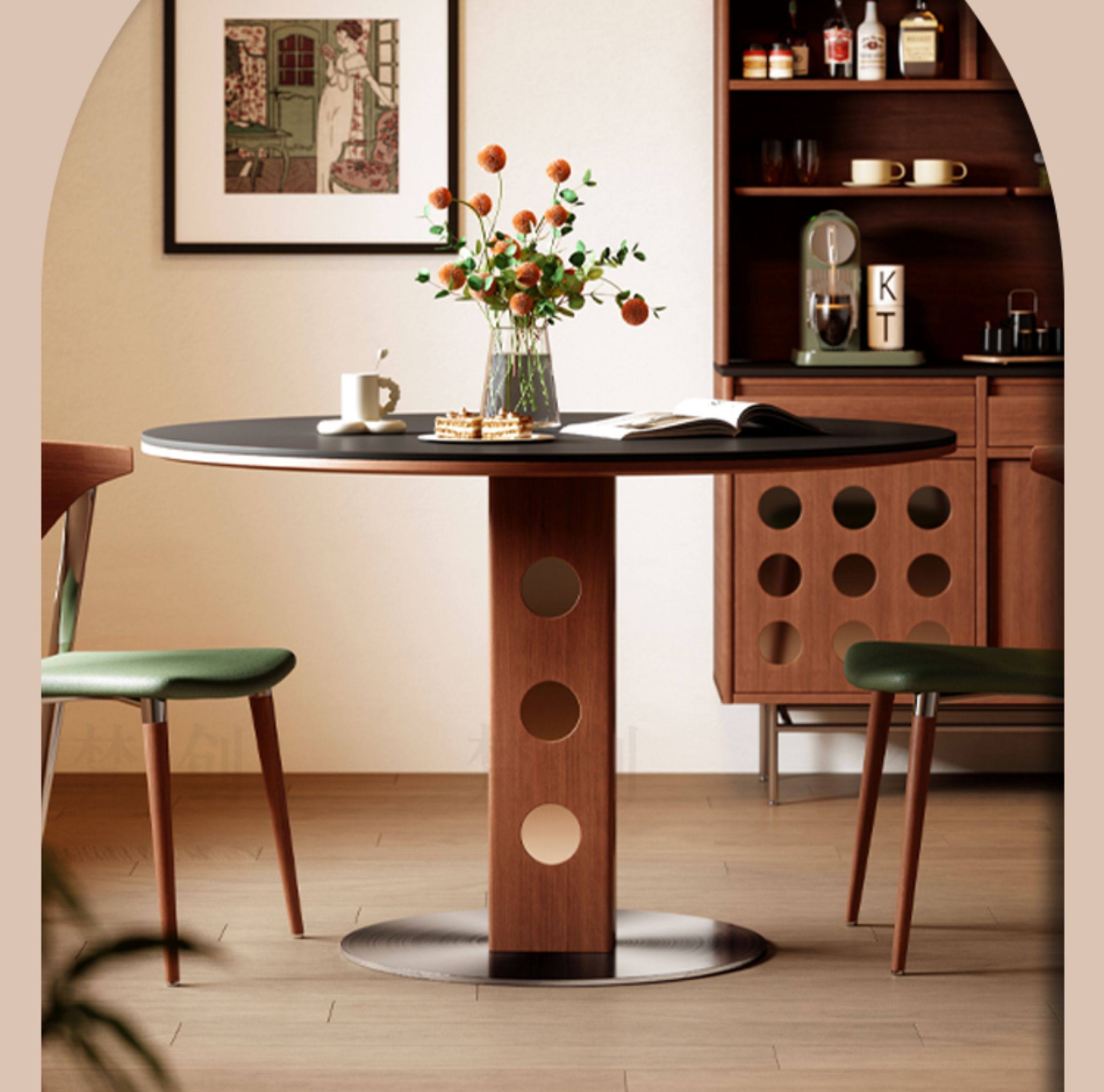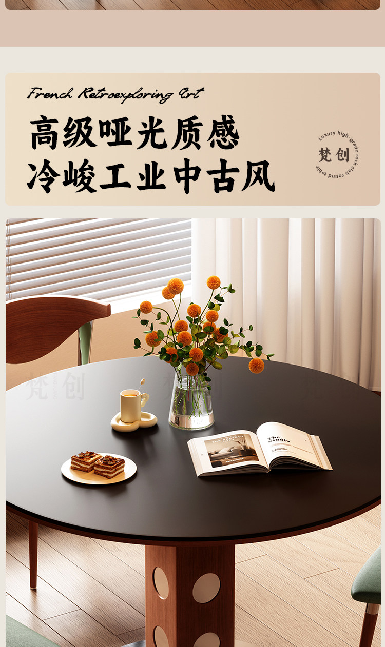 复古风实木岩板餐桌家用小户型纯白圆形胡桃色简约中古风窈窕圆桌