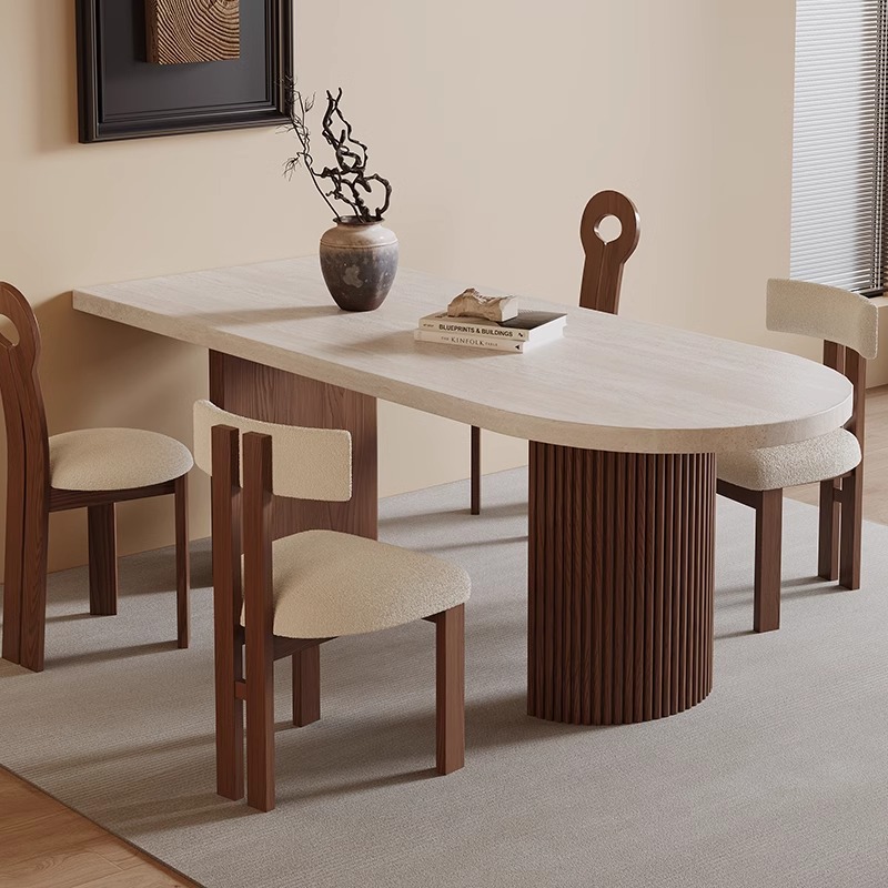 マスターレトロトラバーチンスレートダイニングテーブル小さなアパートクリームスタイルオーバルデザイナーダイニングテーブルと椅子の組み合わせウォールナットカラー