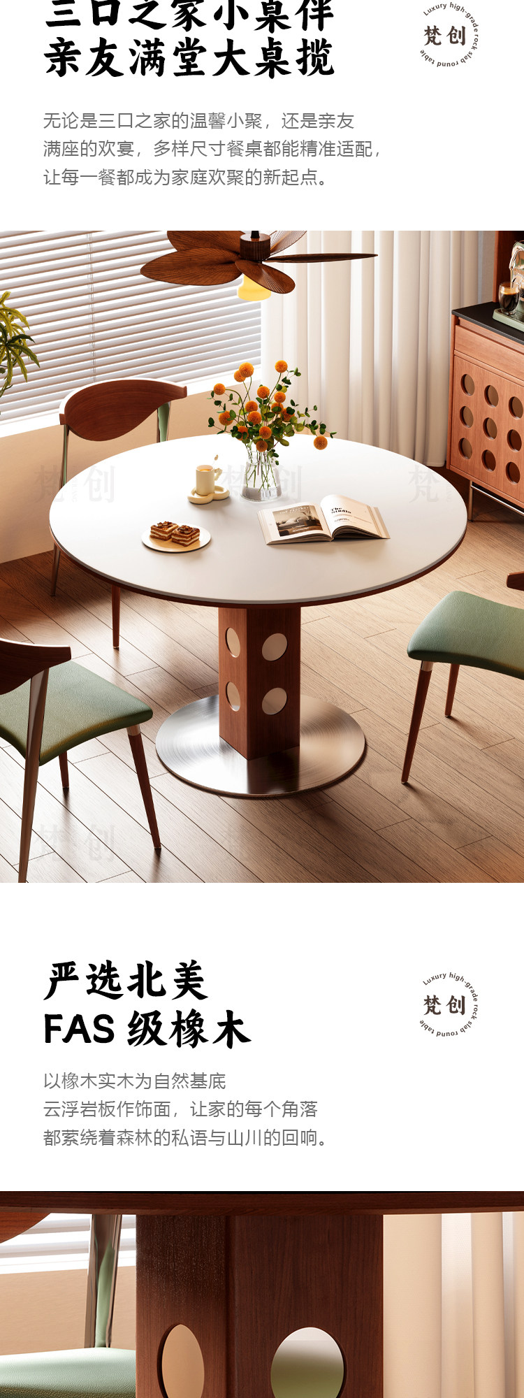 简约原木风洞石岩板小圆桌餐桌家用小户型圆形饭桌设计师桌子实木
