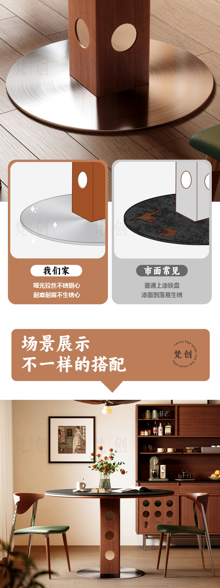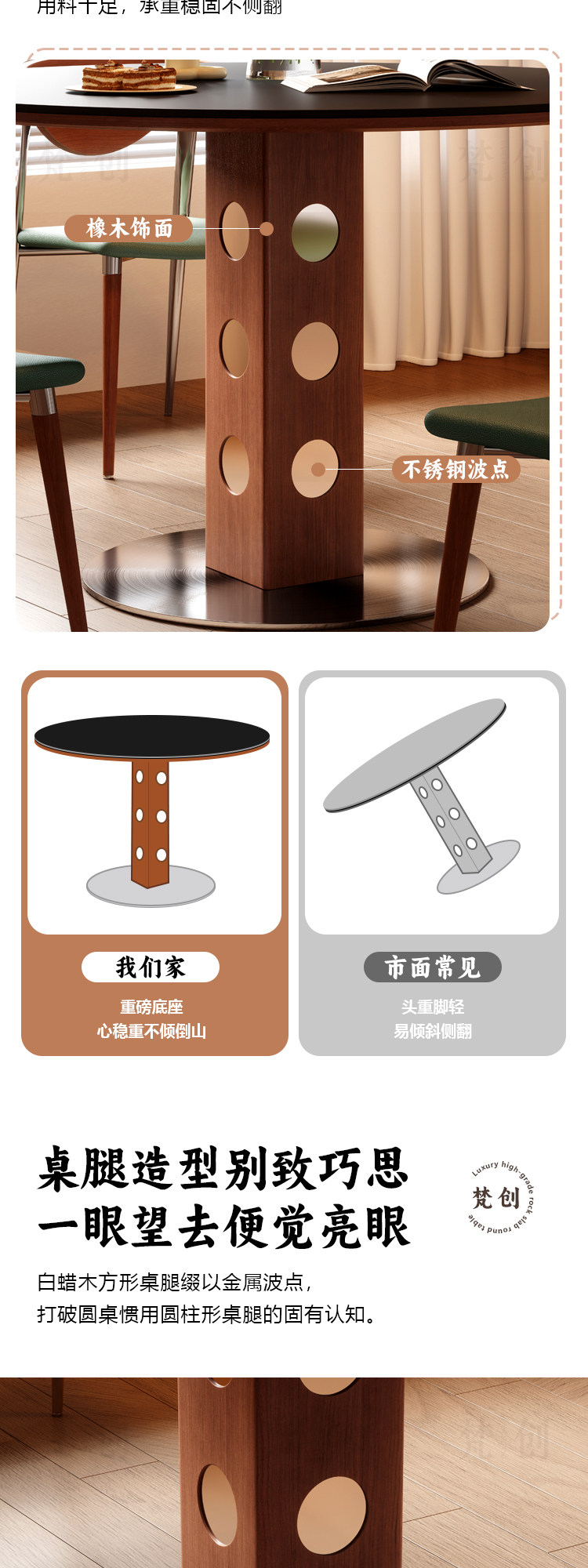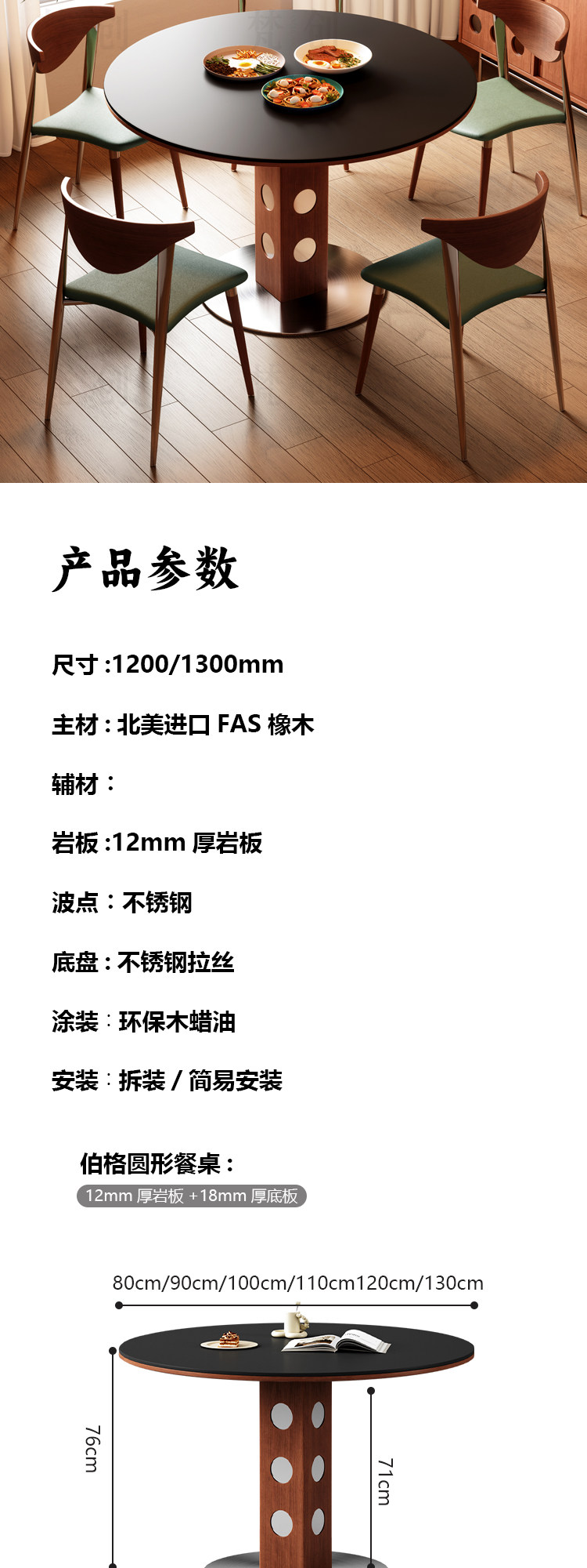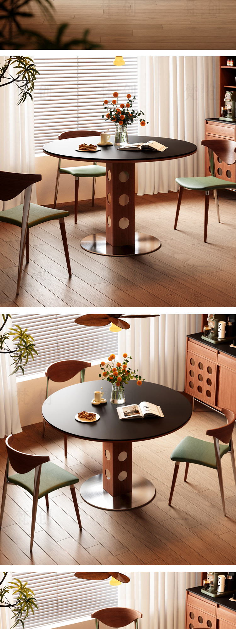 中古风实木岩板圆桌餐桌圆形洞石小户型锈钢白蜡木包豪斯小圆桌子