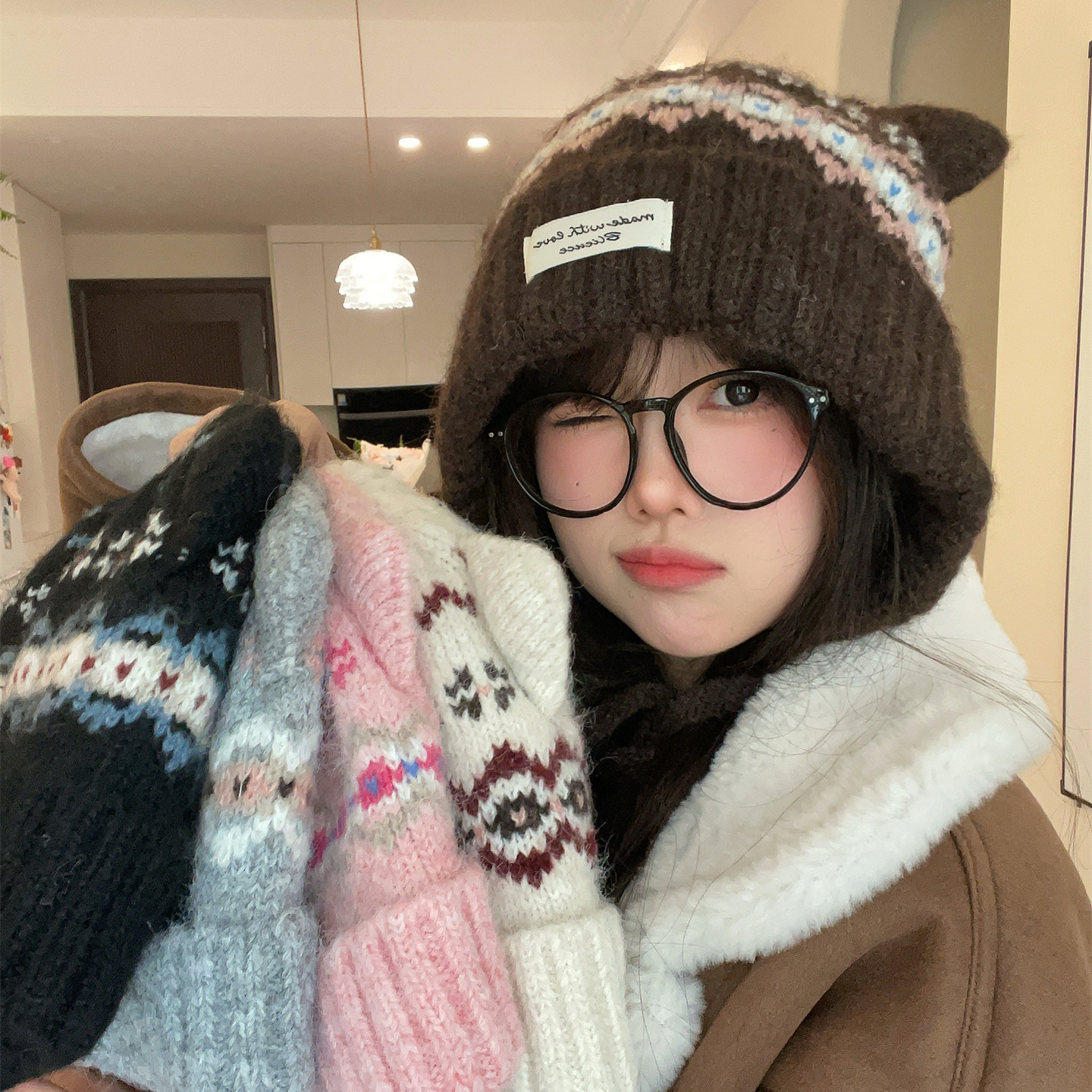 新款可爱猫耳朵加绒针织帽女秋冬加厚保暖护耳雷锋帽显脸小毛线帽
