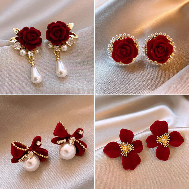 高級感の赤いベルベットのバラの真珠のピアスの女性2025の爆発的なイヤリングの気質は新年の秋冬のイヤリングに合わせます。