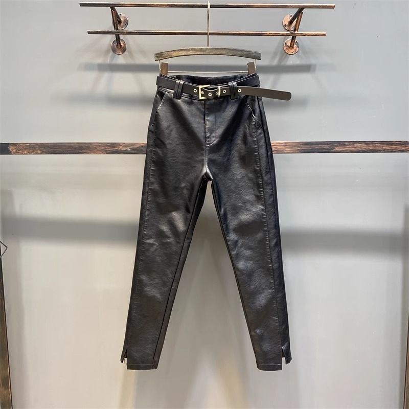 革のズボンの女性の秋冬2024年の新型の高腰はゆったりしていて、やせています。