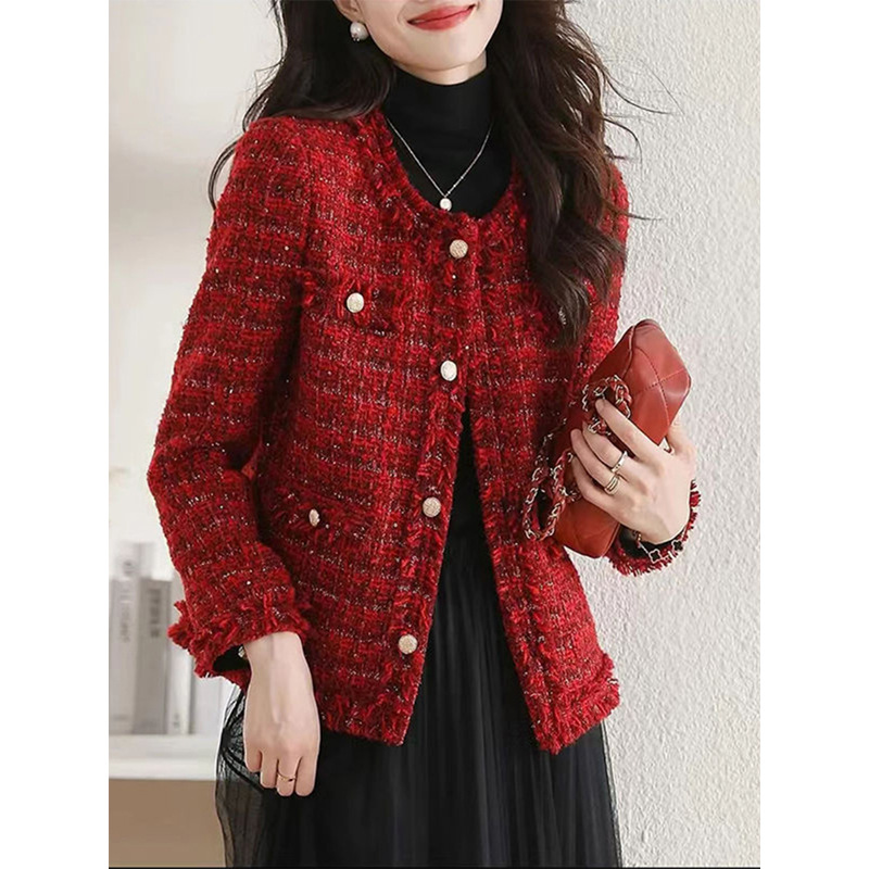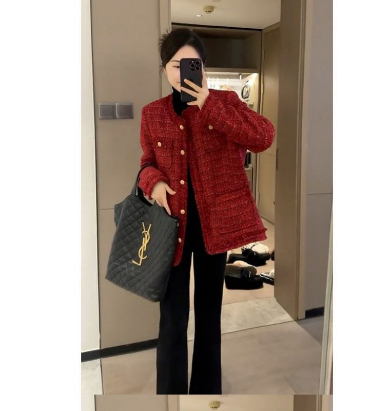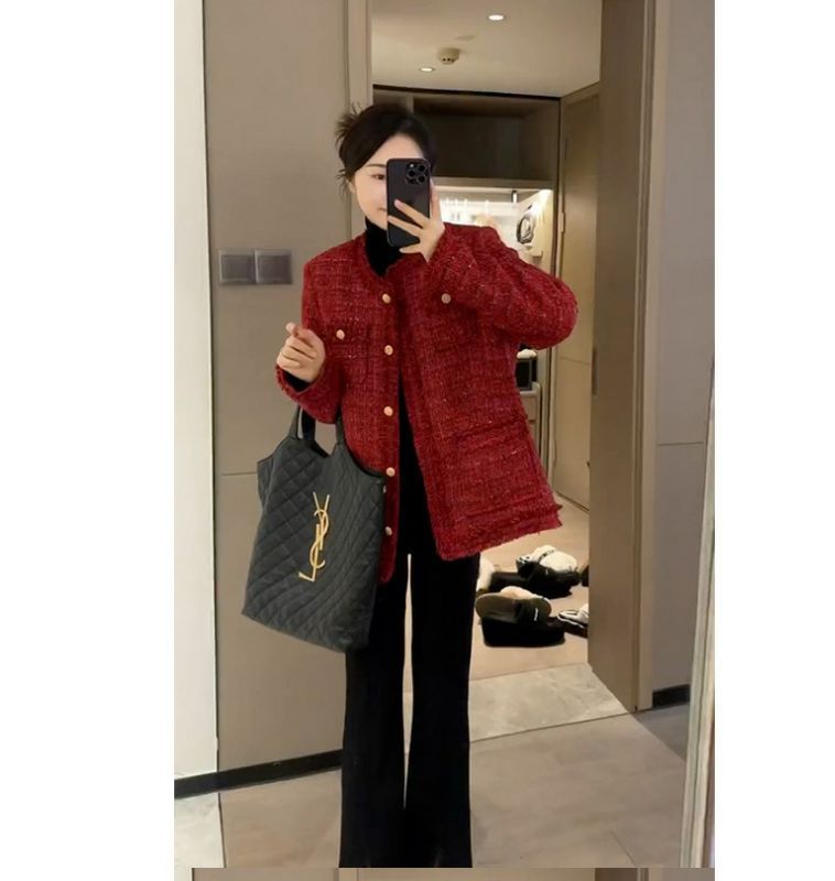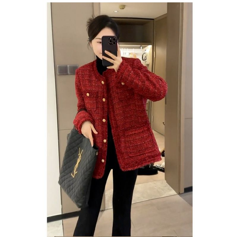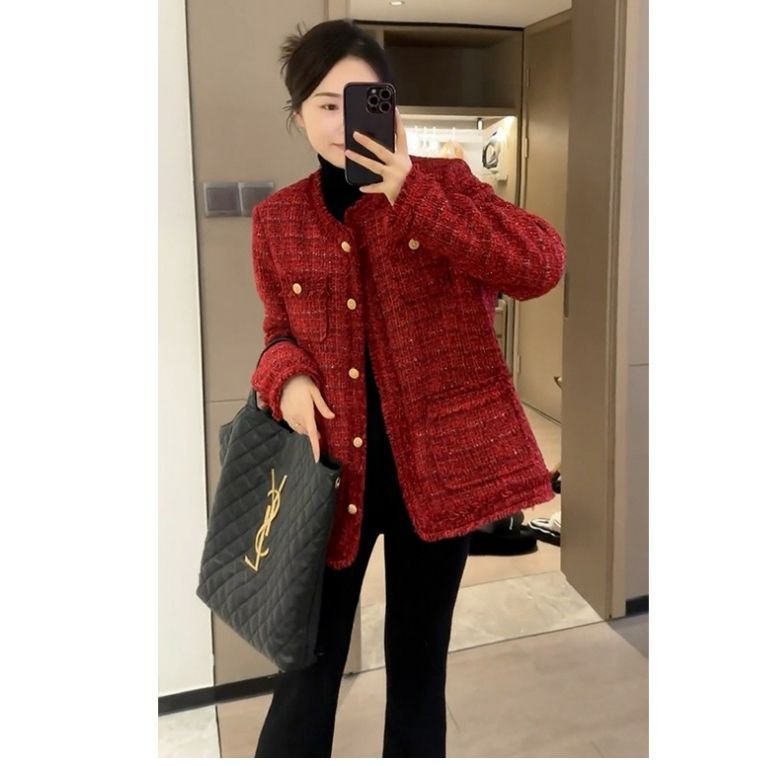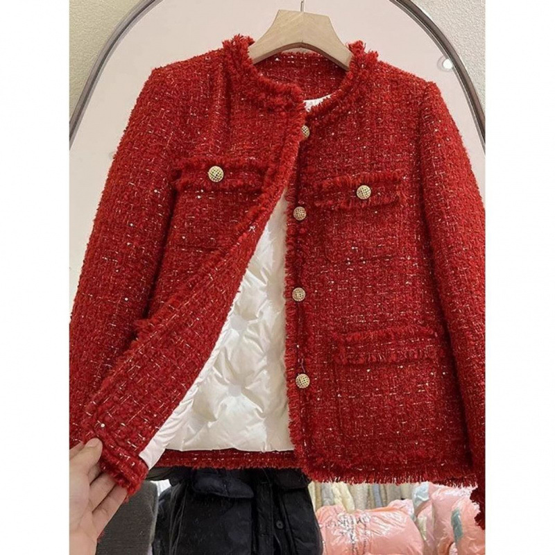 ワインレッドの小香風ジャケット レディース 秋冬2025新作 小柄な女性向け 厚手ショート丈 本命年 ダウンコットン